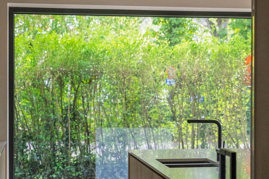 Grâce aux grandes fenêtres, l'espace de vie est baigné de lumière naturelle.