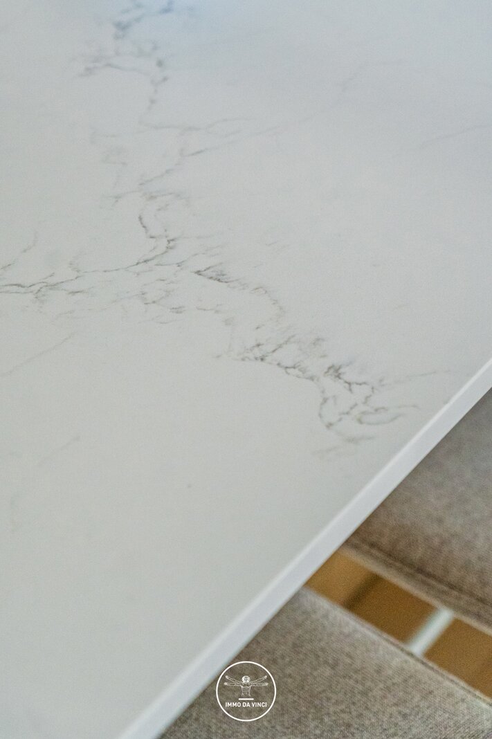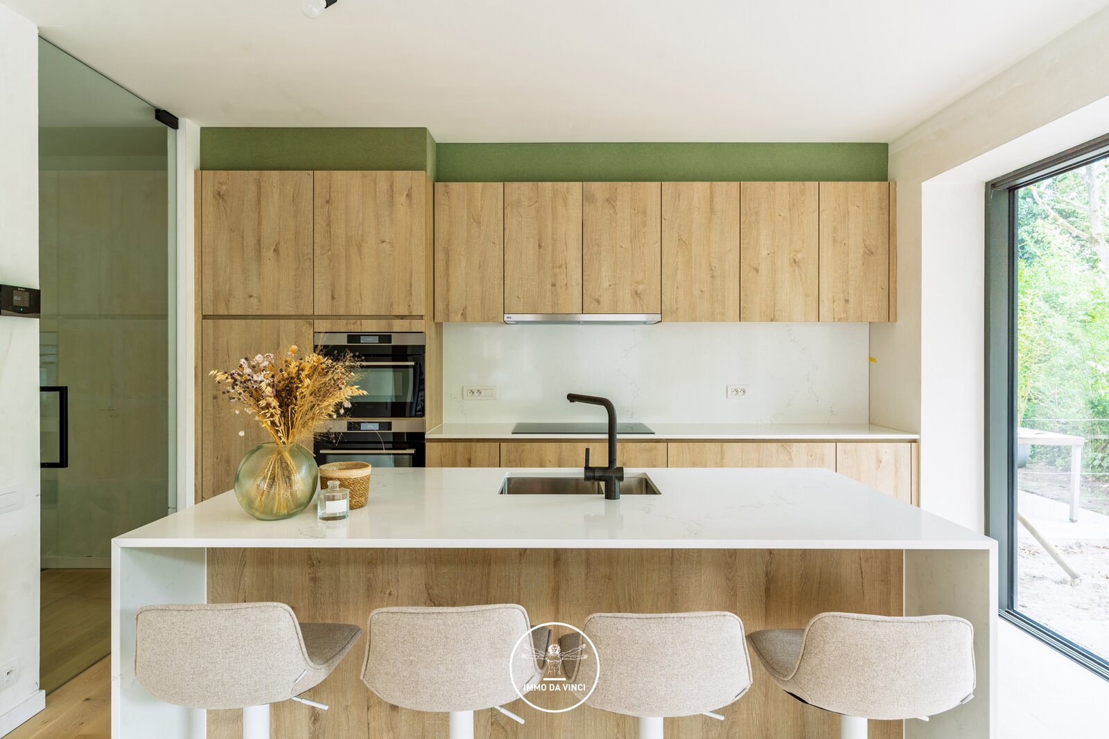 Une élégante porte vitrée vous conduit à l'espace de vie avec cuisine ouverte équipée d'un îlot de cuisson.