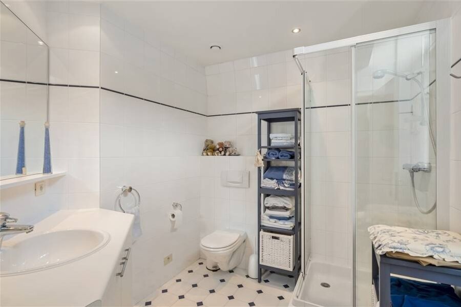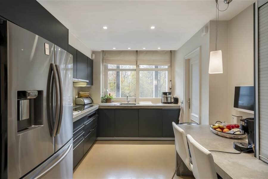 L'ascenseur vous conduit directement dans l'appartement. Vous entrez dans un hall d'entrée spacieux sur sol époxy, équipé d'un WC pour invités et d'un vestiaire. Depuis le hall d'entrée, vous avez accès à la cuisine séparée sur sol époxy, équipée, entre autres, d'une plaque de cuisson avec hotte, d'un teppanyaki, d'une machine à café encastrée, d'un lave-vaisselle, d'un four combiné/micro-ondes, d'un micro-ondes séparé, d'un double réfrigérateur et d'un évier.