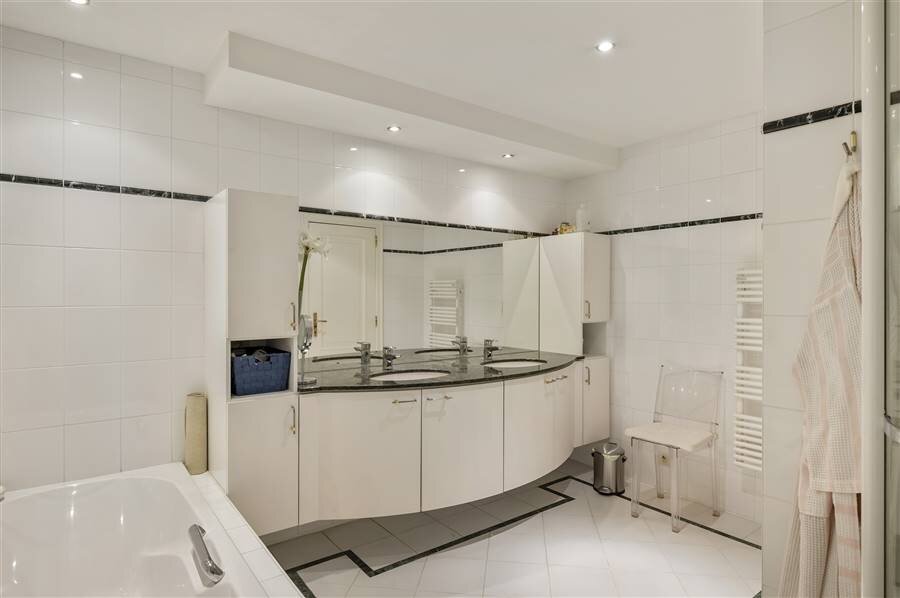Un passage sur parquet, avec des armoires encastrées, mène à la première chambre sur parquet, avec des armoires encastrées et une salle de bains entièrement équipée sur sol carrelé, avec baignoire, douche, double lavabo et toilettes.