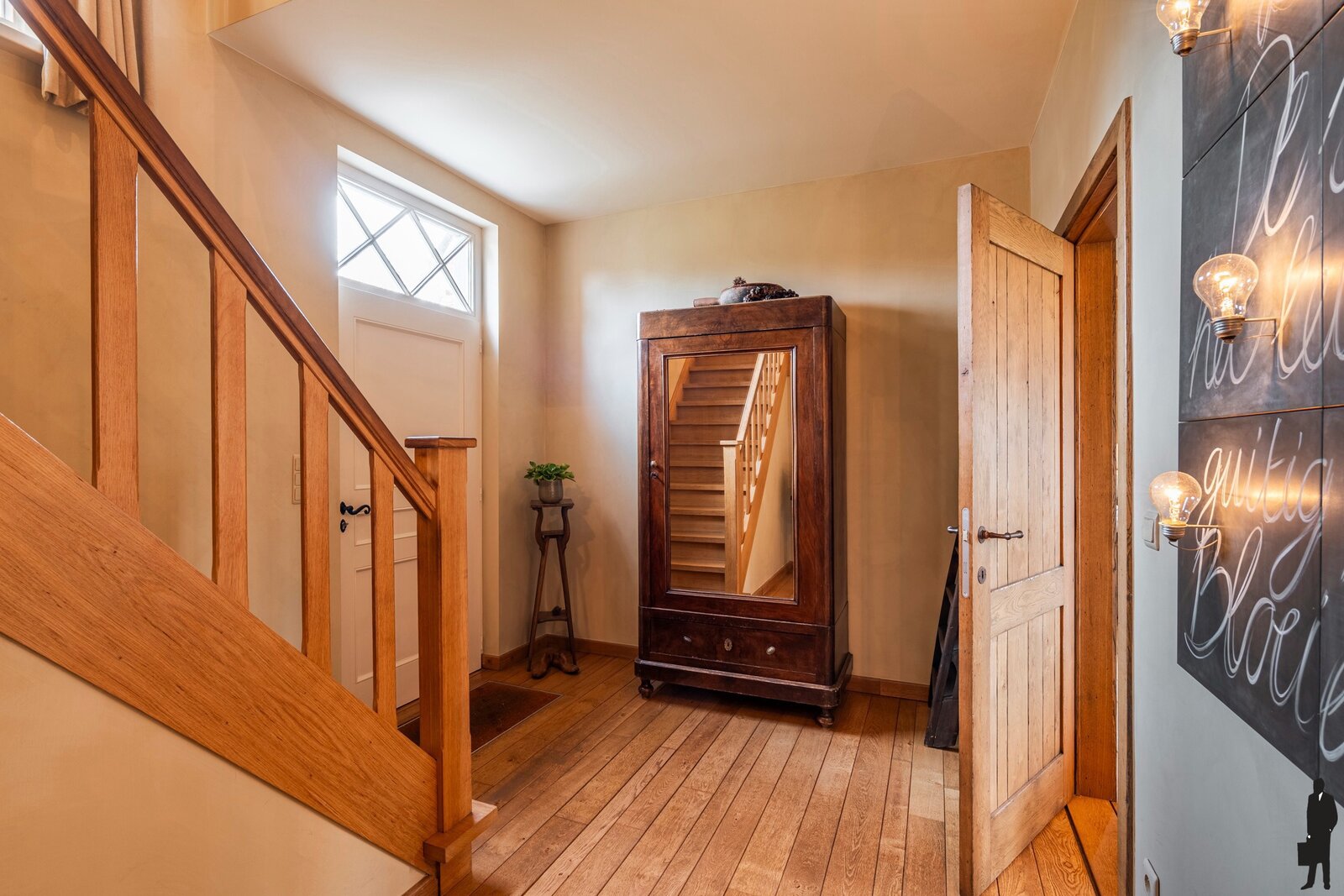 U betreedt de woning via de ruime inkomhal met een prachtig eikenhouten trap. Via deze hal heeft u toegang tot de ruime leefruimte, met gezellige woonkamer, lichtrijke eetkamer en grote open keuken. Deze leefruimte op eiken parket geniet van veel natuurlijk daglicht en voelt tegelijk huiselijk en warm aan.
