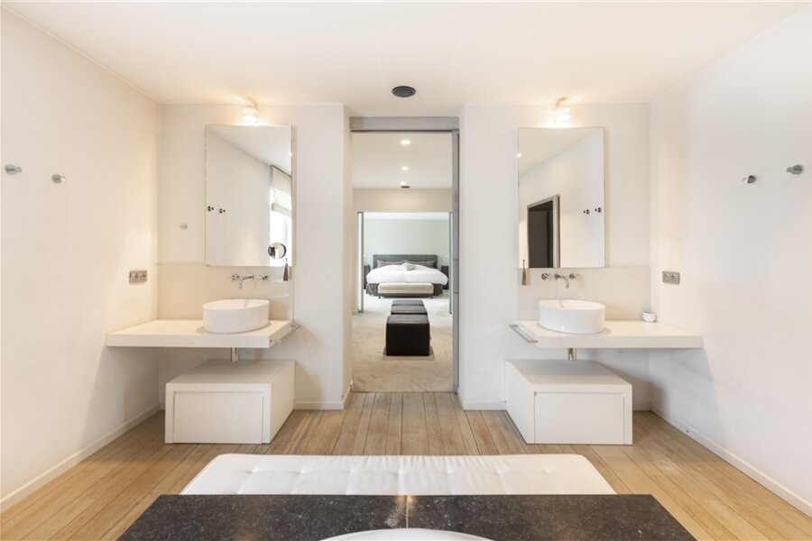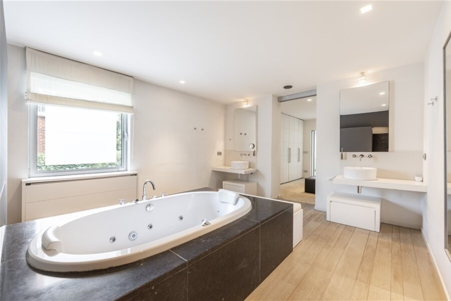 Impressionnante chambre principale avec dressing attenant et salle de bains très luxueuse avec jacuzzi, douche et 2 lavabos.