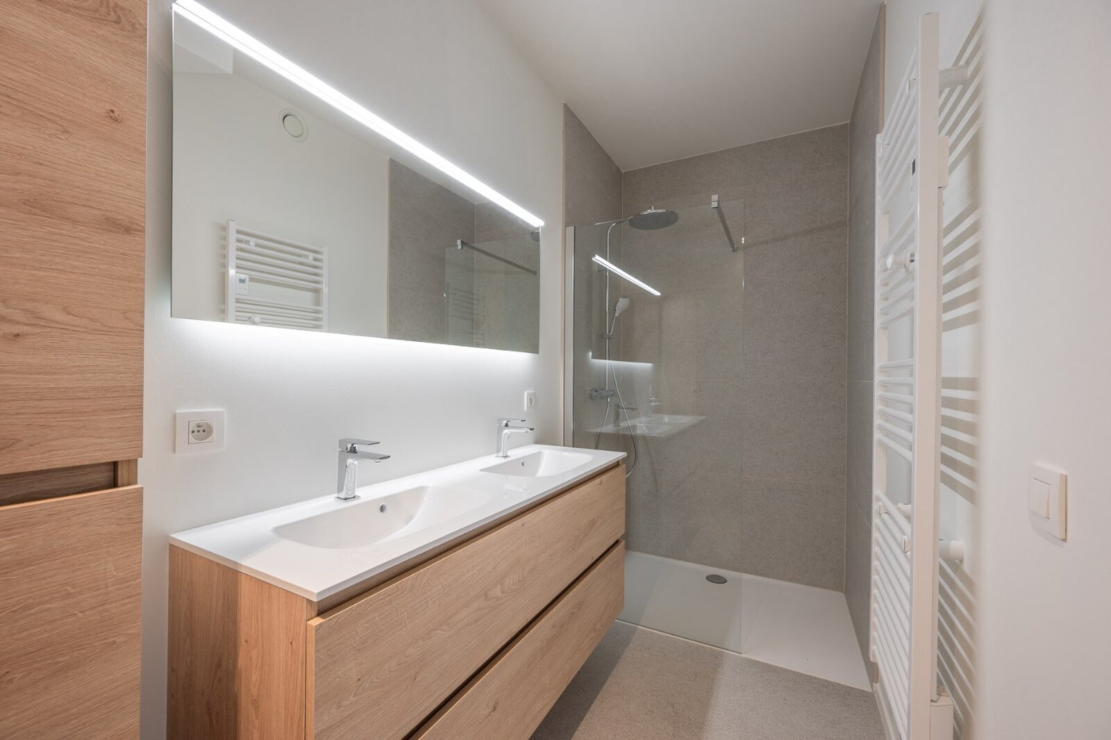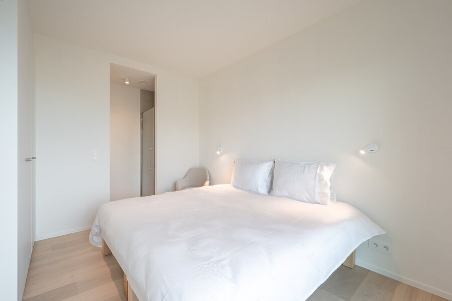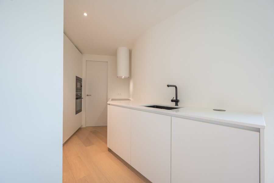 Au sixième étage : Hall d'entrée avec vestiaire et toilette séparée, living lumineux avec de grandes fenêtres qui apportent beaucoup de lumière, terrasse sur toute la largeur de l'appartement, cuisine ouverte entièrement équipée, première chambre à coucher avec salle de douche.