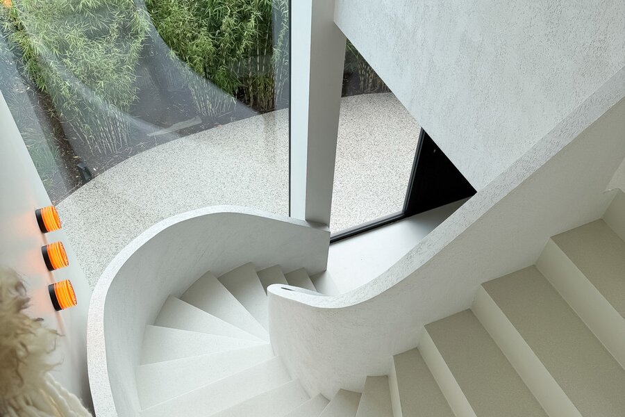 La cuisine ouverte, au design sobre et sophistiqué, est équipée d’un îlot central en pierre naturelle et d’électroménagers de haute qualité. Une arrière-cuisine pratique dissimule toutes les installations techniques tout en offrant des rangements supplémentaires. Le sol de la maison est revêtu d’un béton coulé de qualité supérieure, écologique et insonorisant, qui confère à l’ensemble une atmosphère homogène, moderne et élégante.