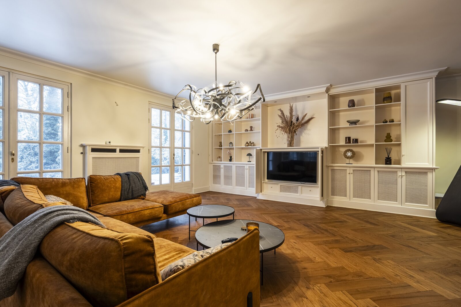 Via de imposante entreehal betreedt u de woning. Aan de linkerzijde bevindt zich een eerste leefruimte die is ingericht met eet- en zitgelegenheid. Aansluitend volgt een afzonderlijke tv-kamer, met daarnaast een bijkomende ruimte die zich leent tot gebruik als bureau of werkkamer.