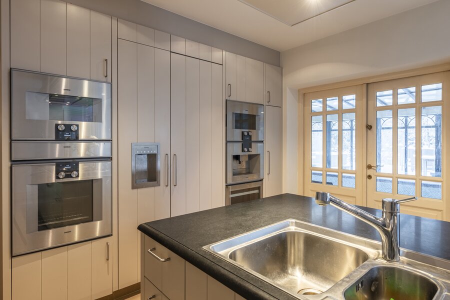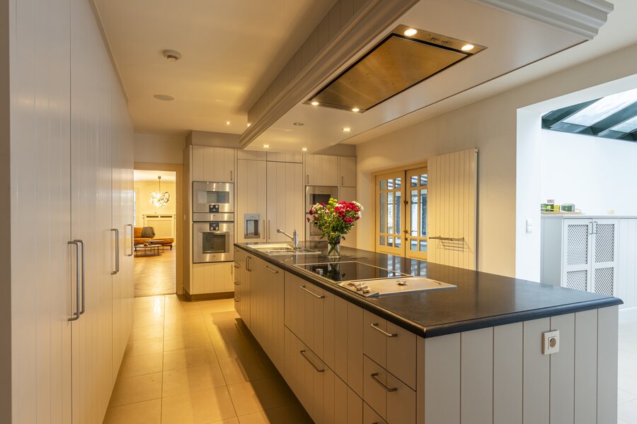 Het hart van de villa is de keuken, welke zich centraal in de villa bevindt. De keuken werd enkele jaren geleden vernieuwd en is uitgerust met kwalitatieve Gaggenau-toestellen. De keuken kijkt uit op het overdekte binnenzwembad en op een aangrenzende, lichtrijke ruimte met glazen dak, ingericht als eet/leefruimte en in direct contact met de tuin. De keuken alsook de ruimte met binnenzwembad verlenen toegang tot de kelderverdieping. Deze heeft een gedeeltelijke barfunctie en een wellnessfunctie, compleet met sauna en douches.