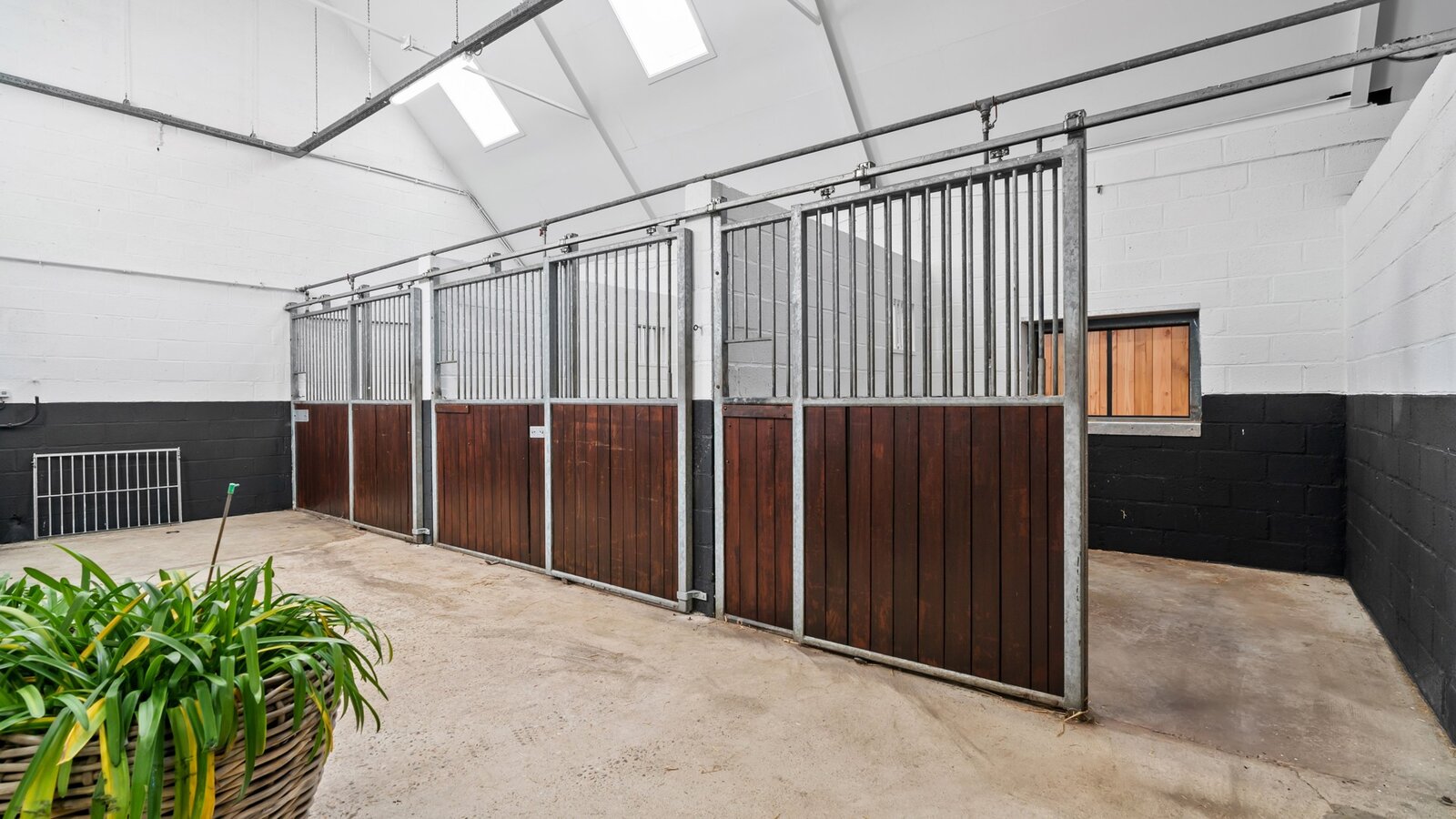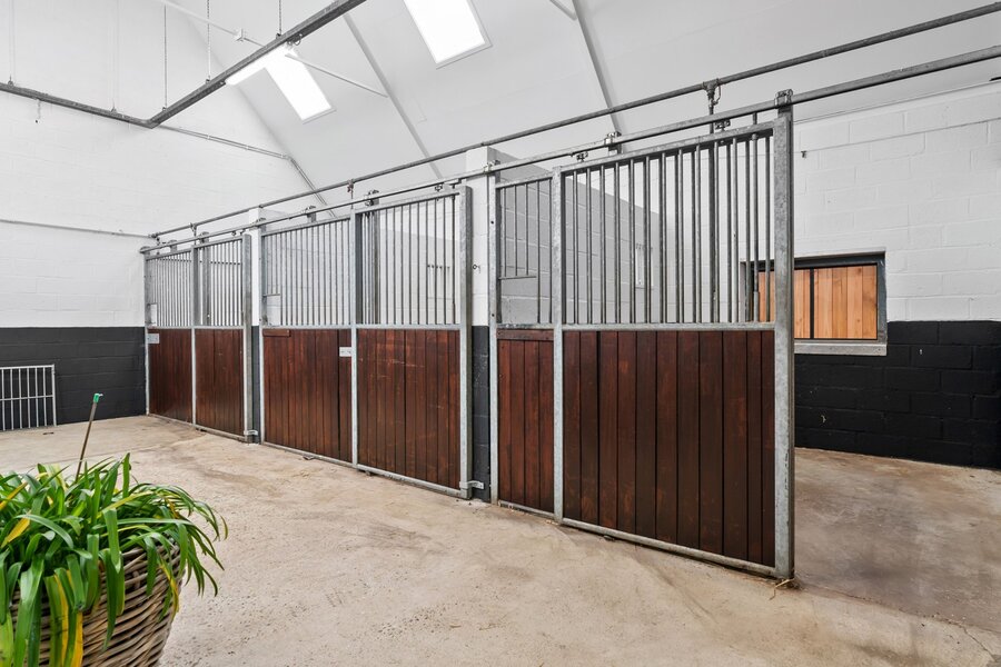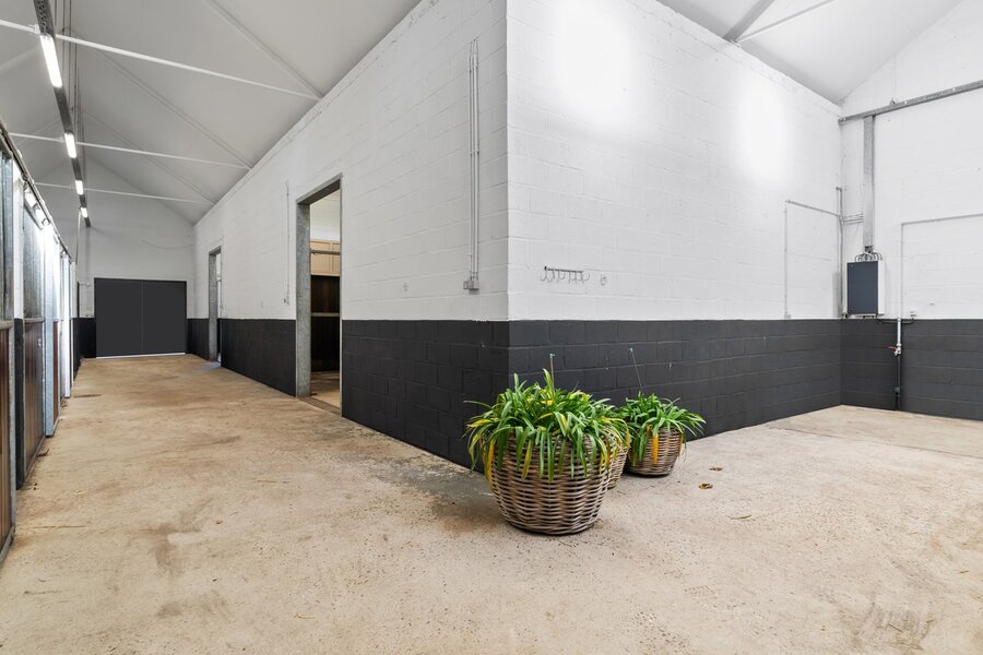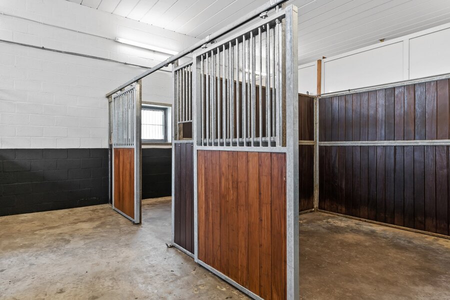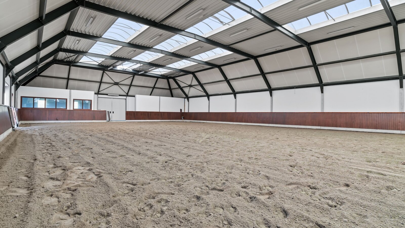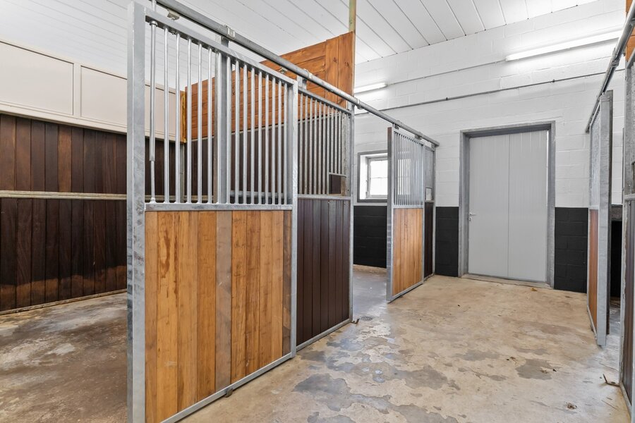 Aan de andere kant van de binnenplaats liggen de stallen, de binnenpiste en de buitenpiste. De binnenpiste meet ca. 20m x 40m en is voorzien van een eb- en vloedbodem. Via de trap langs de piste is er toegang tot de ontvangstruimte/cafetaria. Daarenboven is er een apart toilet en berging aanwezig. Vanuit het deze ruimte is er een mooi zicht op de binnenpiste enerzijds en de stallen anderzijds. Langs de stallen is er nog plaats voor een inpandige stapmolen. In de paardenstal zijn er in totaal 14 boxen aanwezig. De buitenpiste meet ca 20m x 60m en is voorzien van een eb- en vloedbodem.
