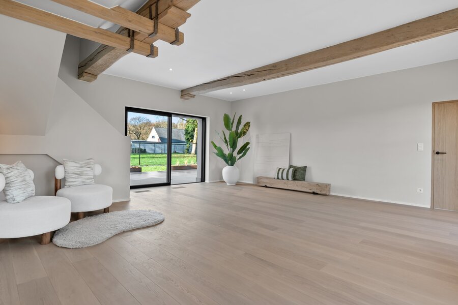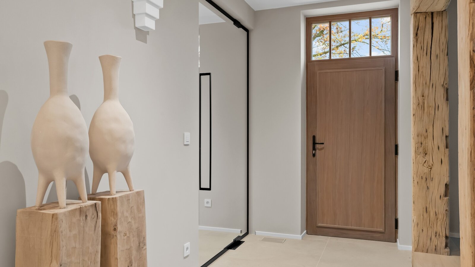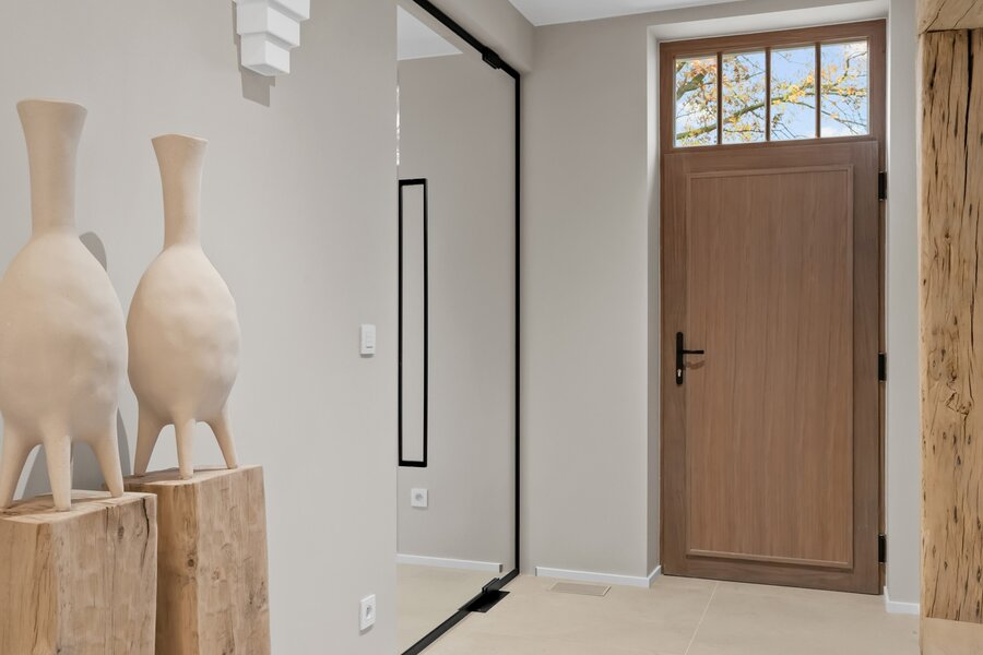 We treden de charmante boerderij binnen via de royale inkomhal, waarbij de oude elementen in het oog springen.