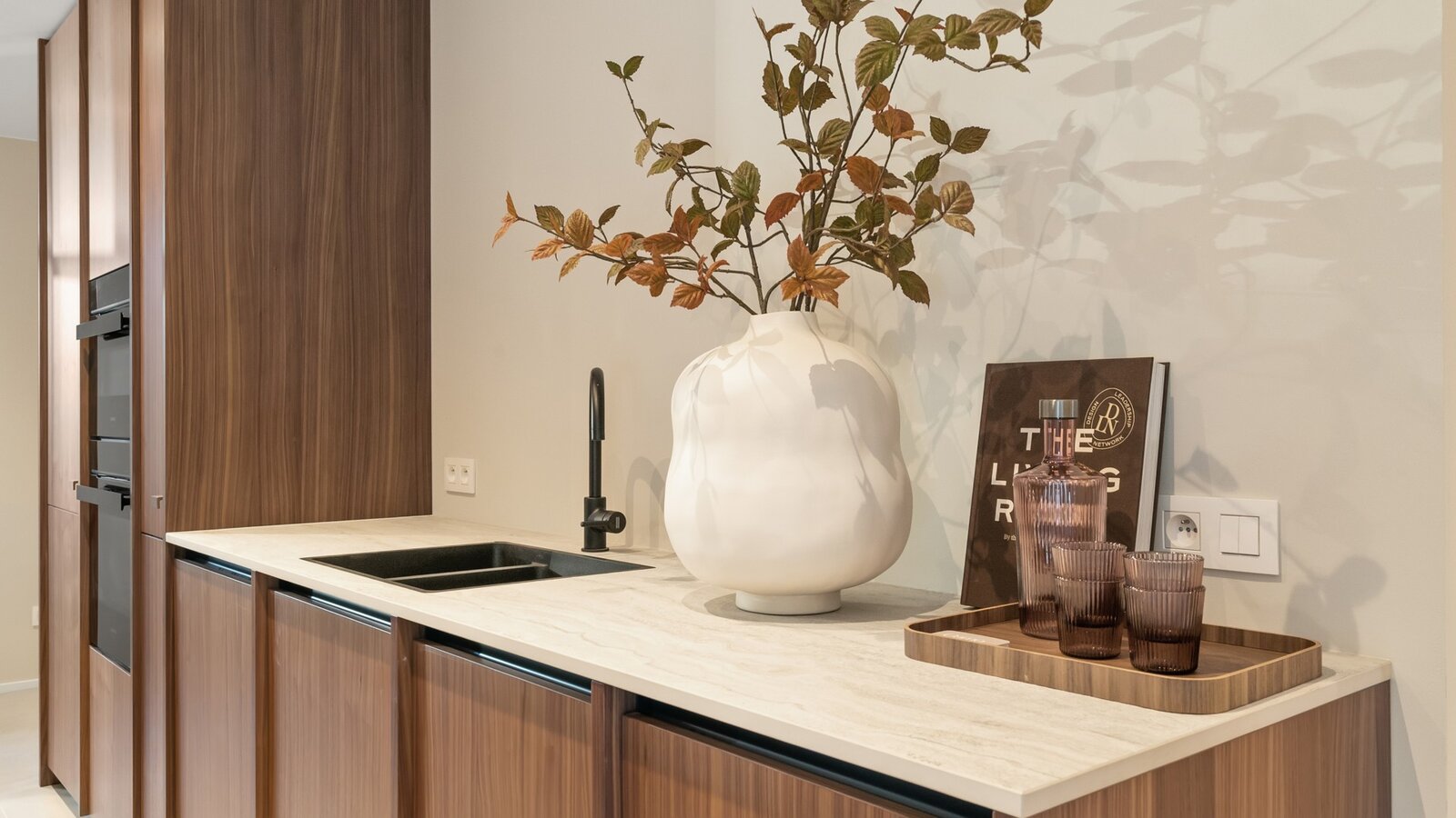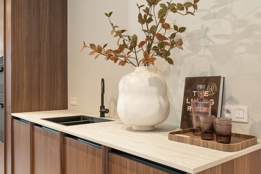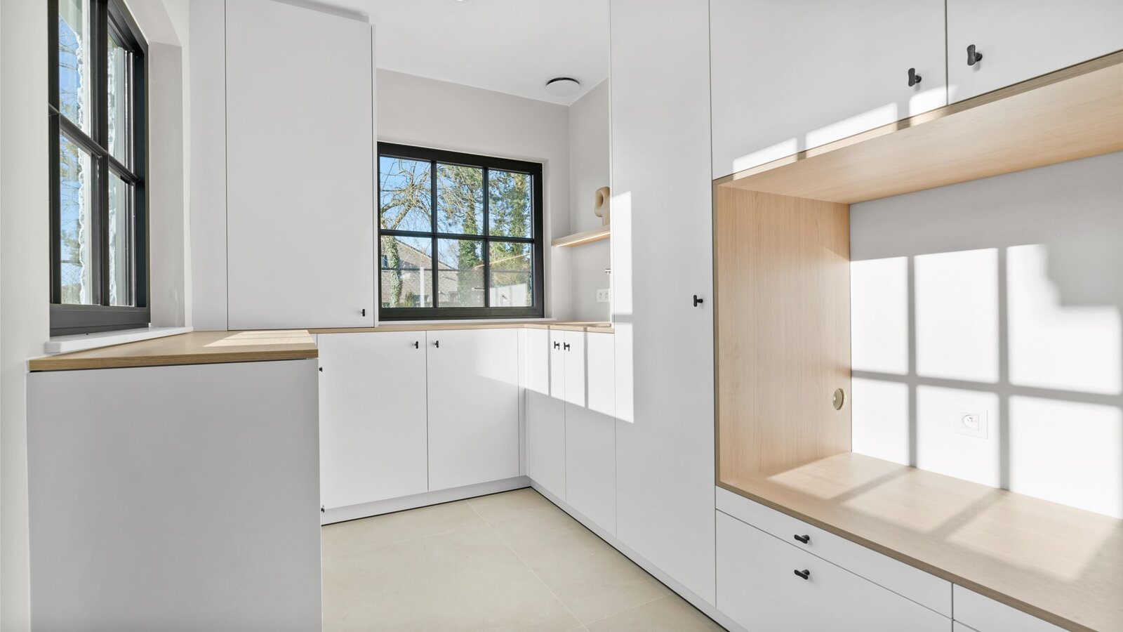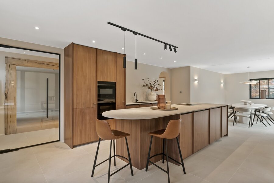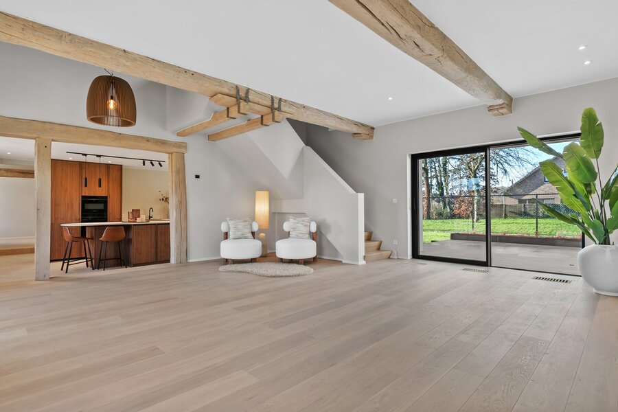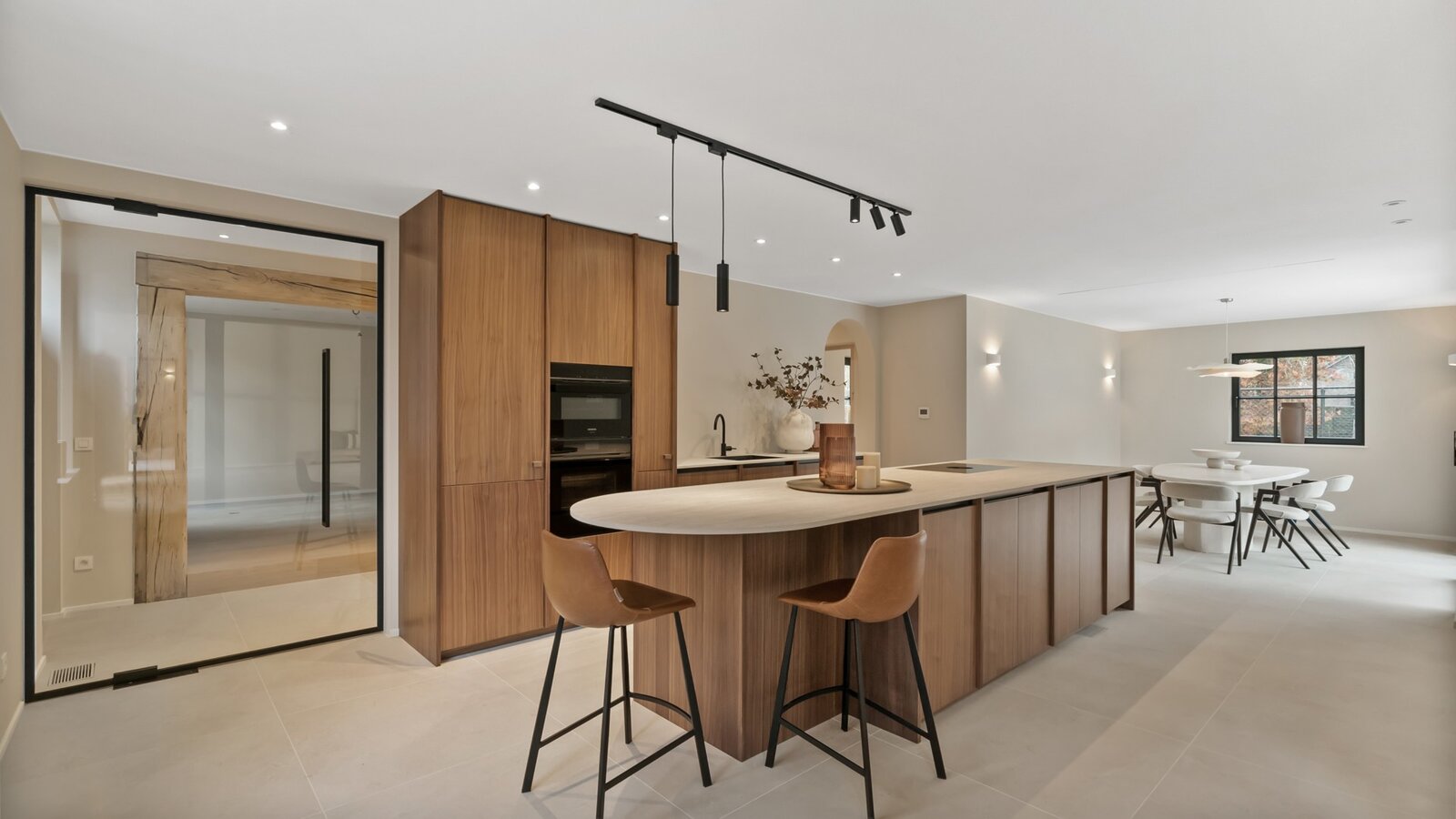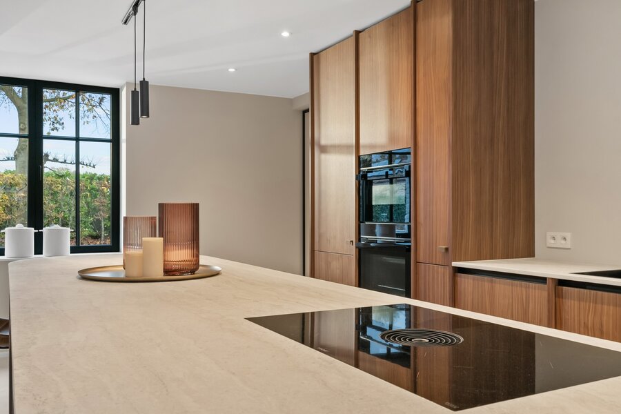 Vanuit de inkomhal krijgt u toegang het bureel, de lichtrijke keuken met eetkamer. Naast de luxueus ingerichte keuken bereiken we de woonkamer.