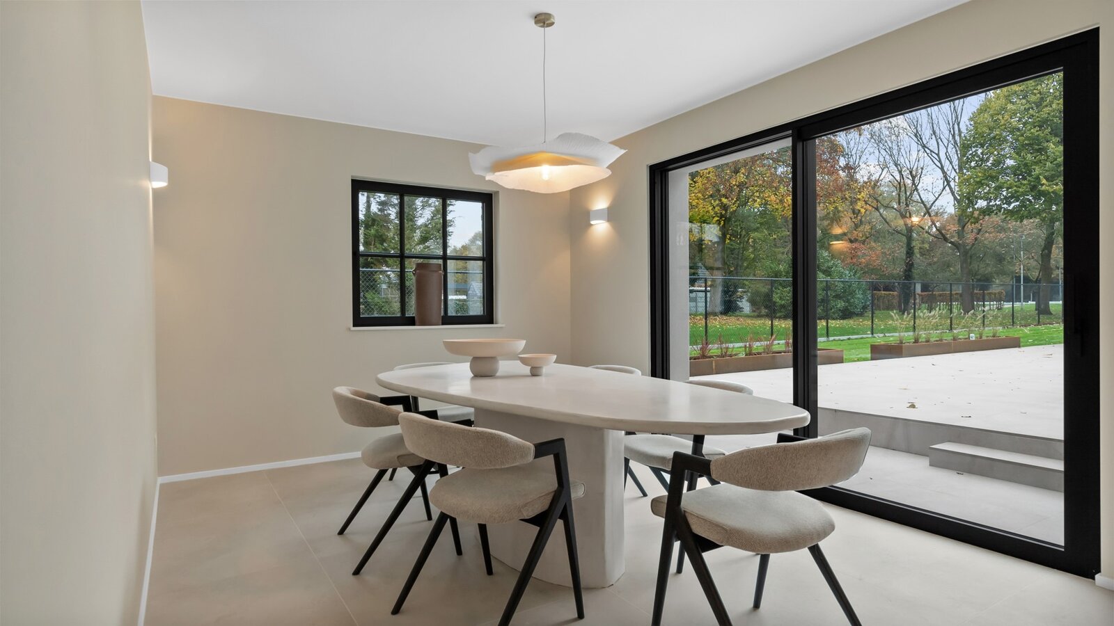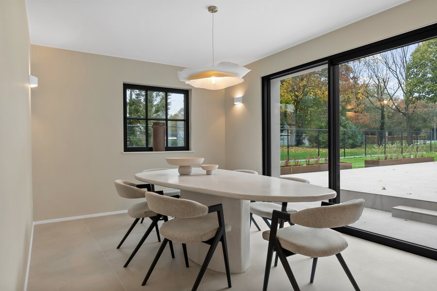 Zowel de leefruimte als de eetkamer en de ontvangstruimte bieden rechtstreeks toegang tot het riant terras.