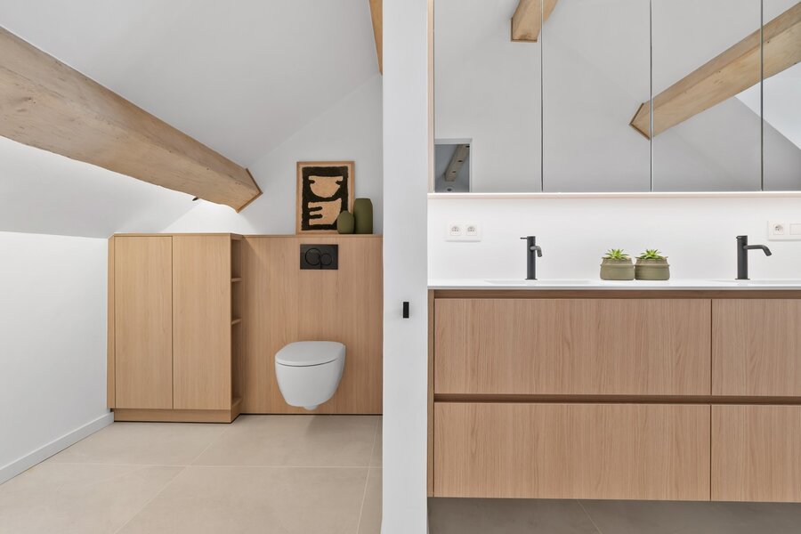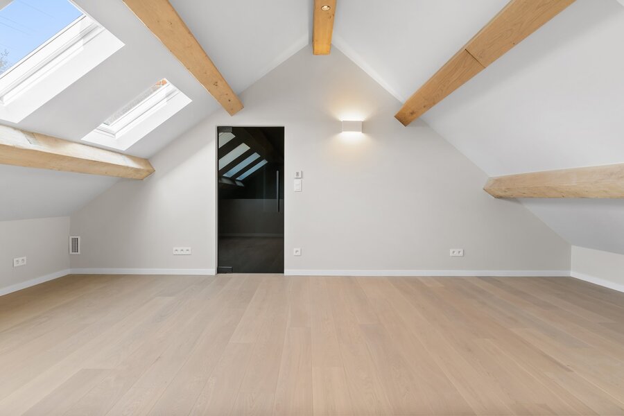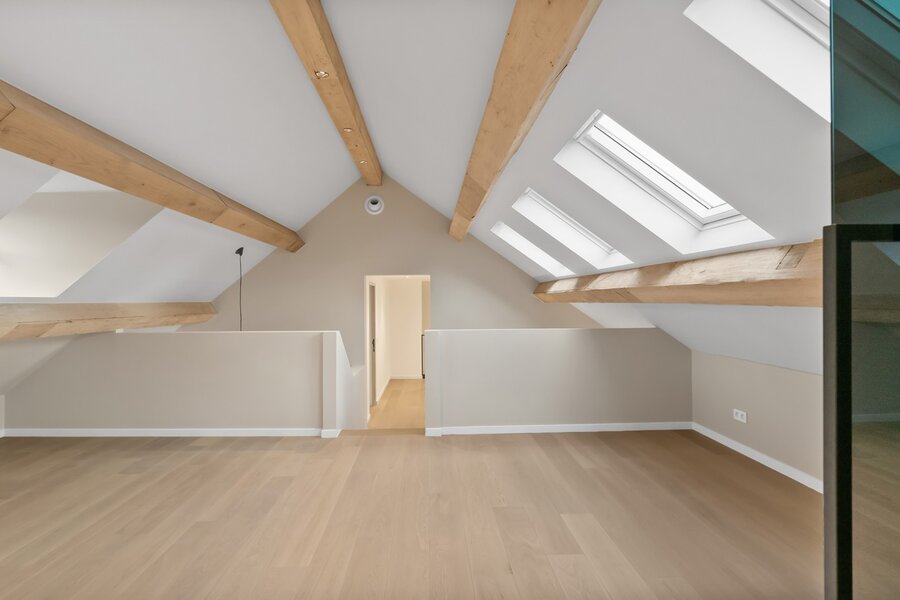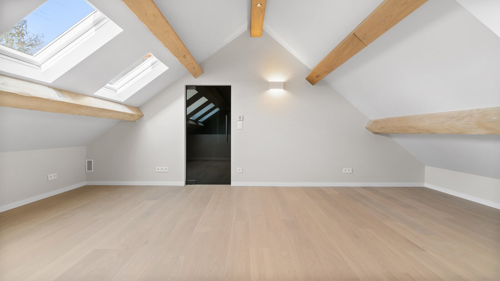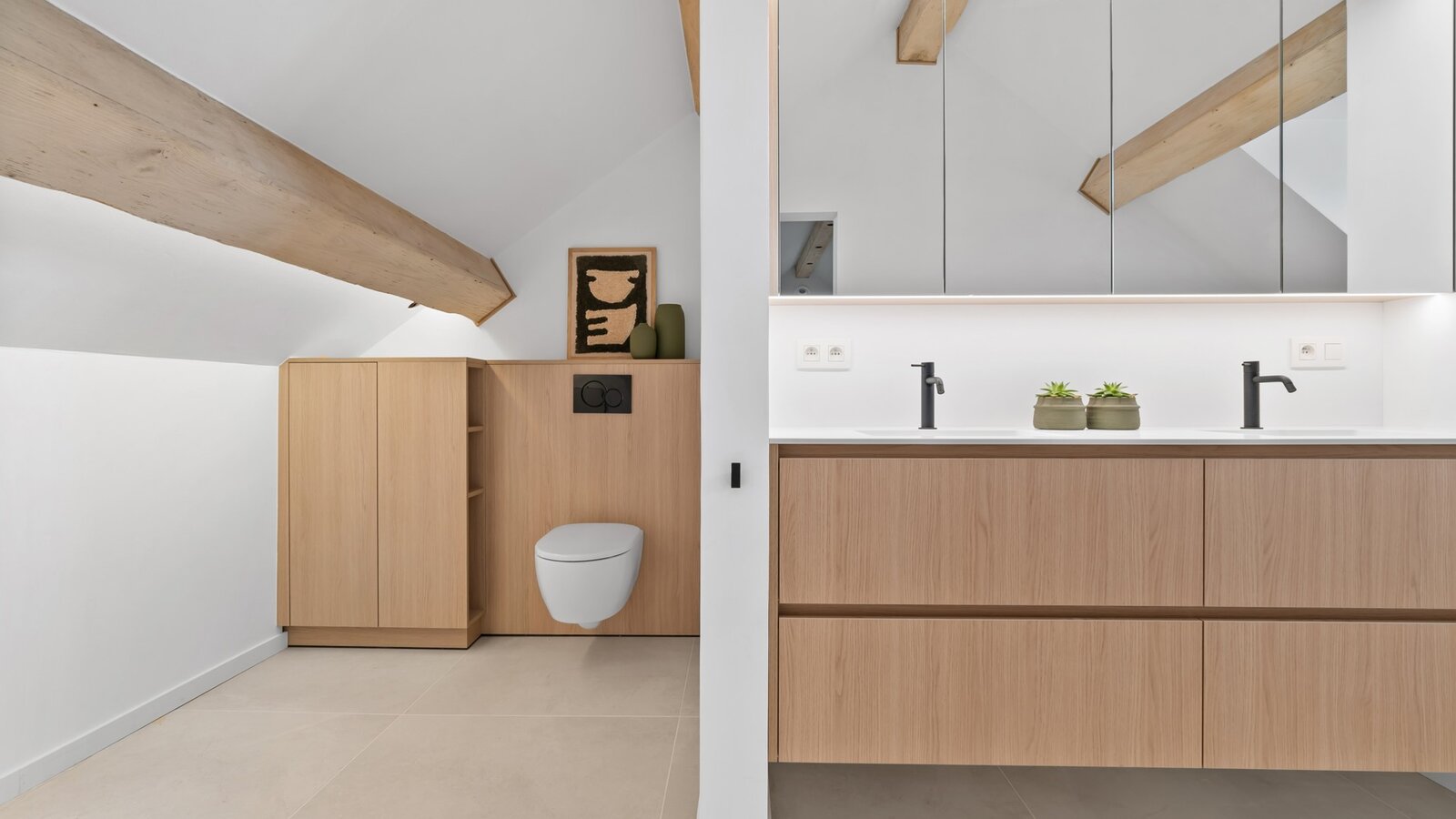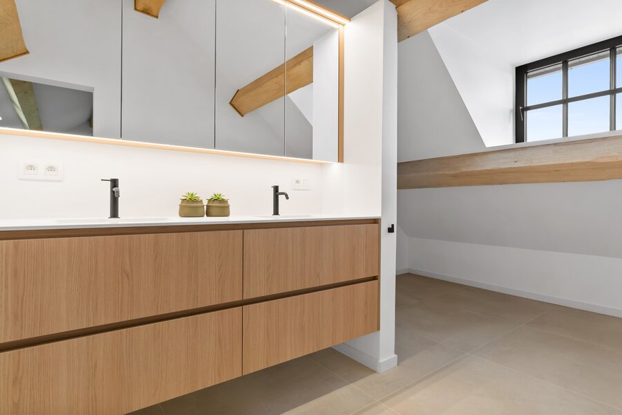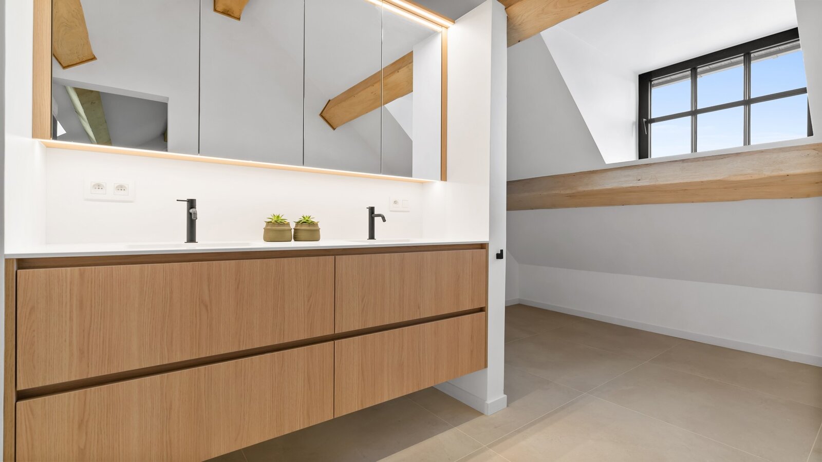 Aan de andere kant is een tv-hoek/ontspanningsruimte voorzien en een tweede ruime badkamer, dewelke voorzien is van een dubbele wastafel, een inloopdouche en een toilet.