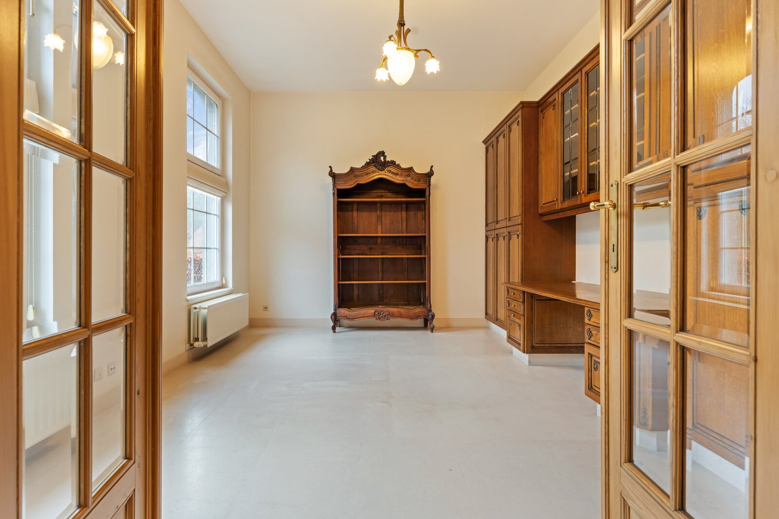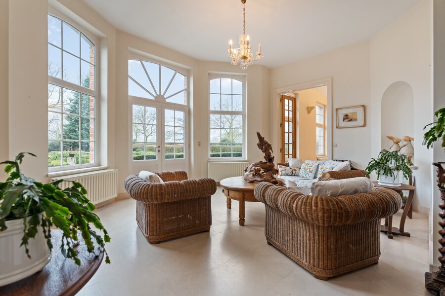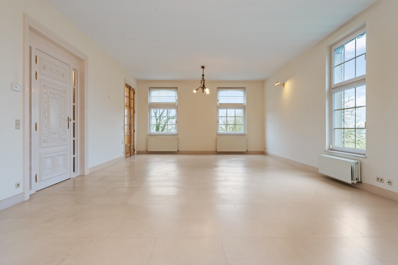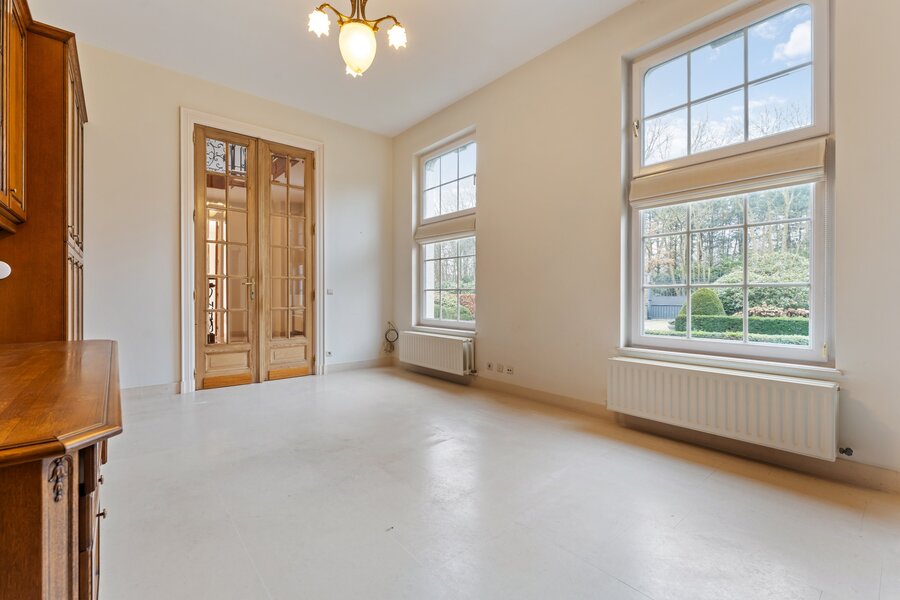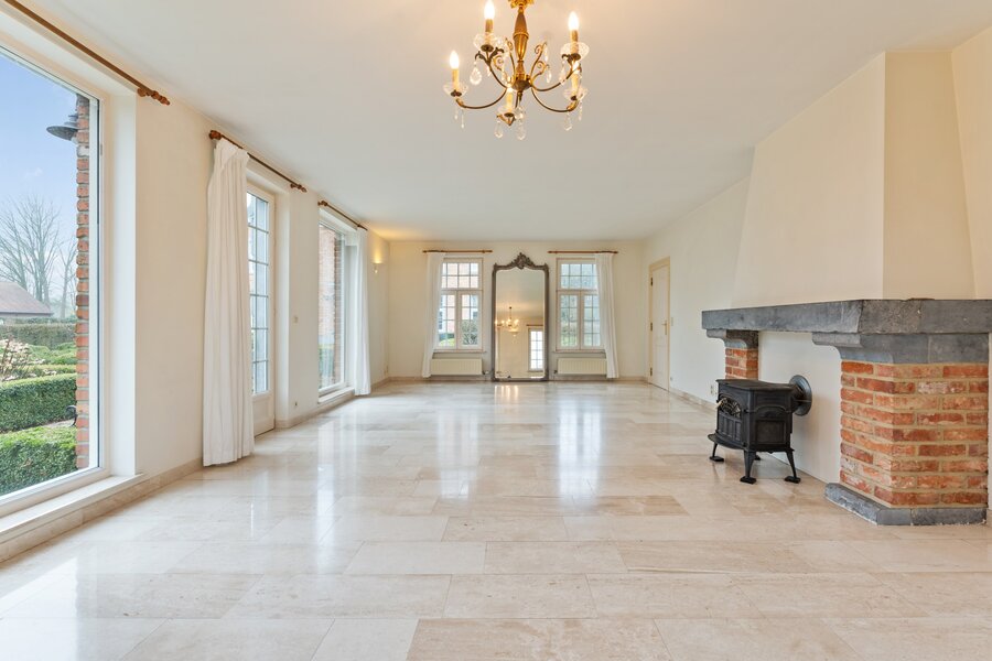 En entrant au rez-de-chaussée, vous êtes accueilli dans un grand hall d'entrée avec un magnifique escalier. Du hall d'entrée, vous avez accès à la partie salon et au bureau situé à l'avant de la villa. Dans le salon, vous pourrez vous détendre près de la magnifique cheminée ouverte française. Cet espace peut être parfaitement divisé en un coin salon et un coin repas. Toutes les pièces de vie offrent une vue panoramique sur le jardin aménagé et les champs environnants.