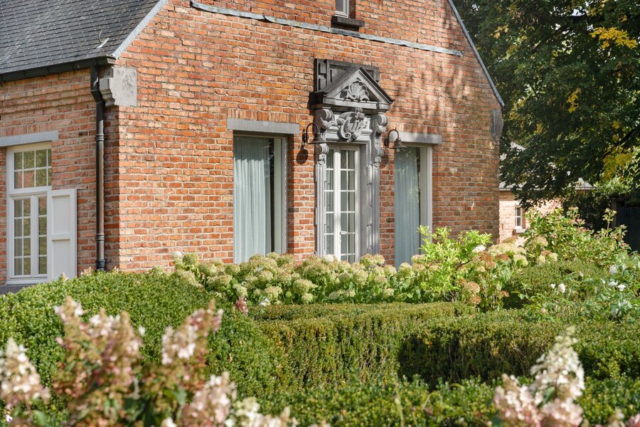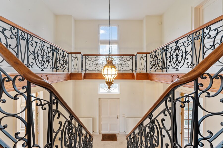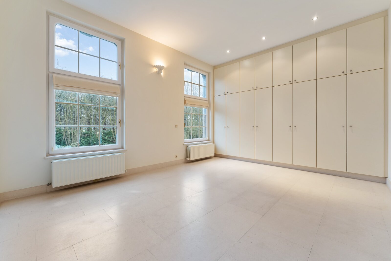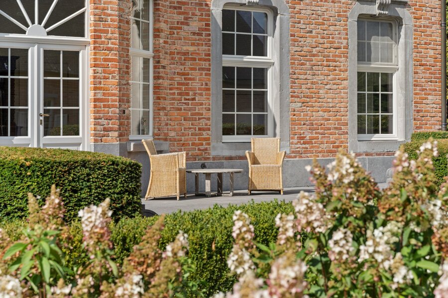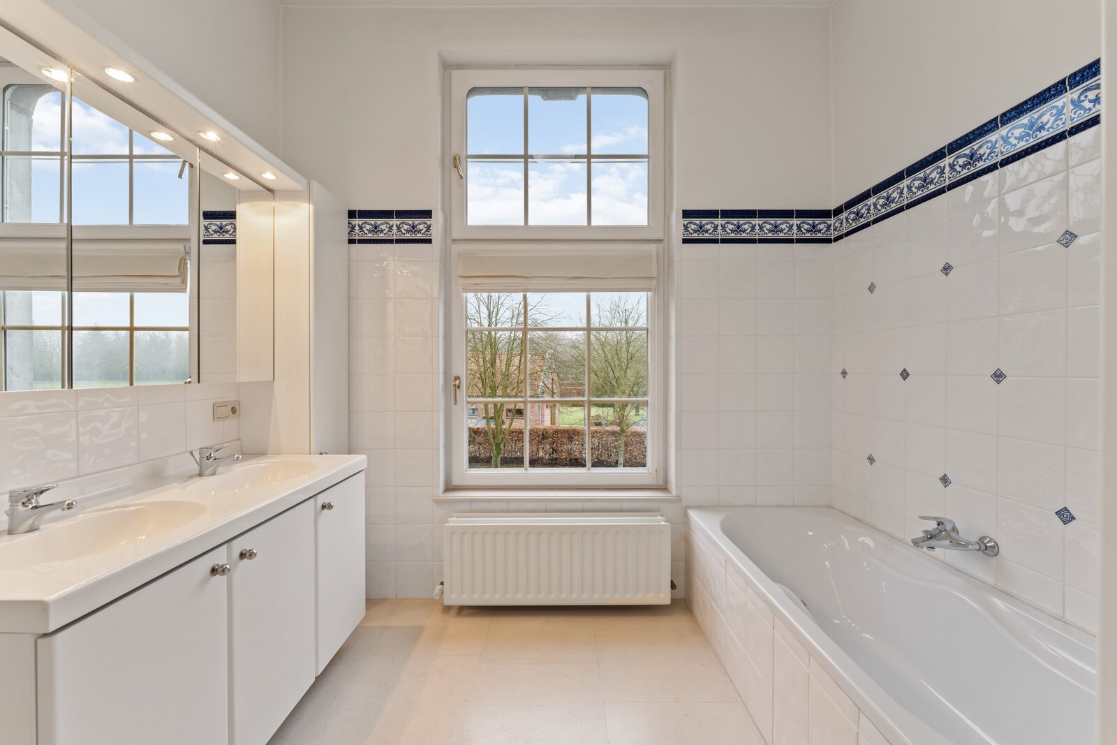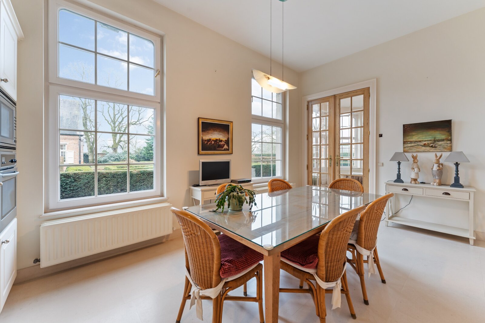 En entrant au rez-de-chaussée, vous êtes accueilli dans un grand hall d'entrée avec un magnifique escalier. Du hall d'entrée, vous avez accès à la partie salon et au bureau situé à l'avant de la villa. Dans le salon, vous pourrez vous détendre près de la magnifique cheminée ouverte française. Cet espace peut être parfaitement divisé en un coin salon et un coin repas. Toutes les pièces de vie offrent une vue panoramique sur le jardin aménagé et les champs environnants.