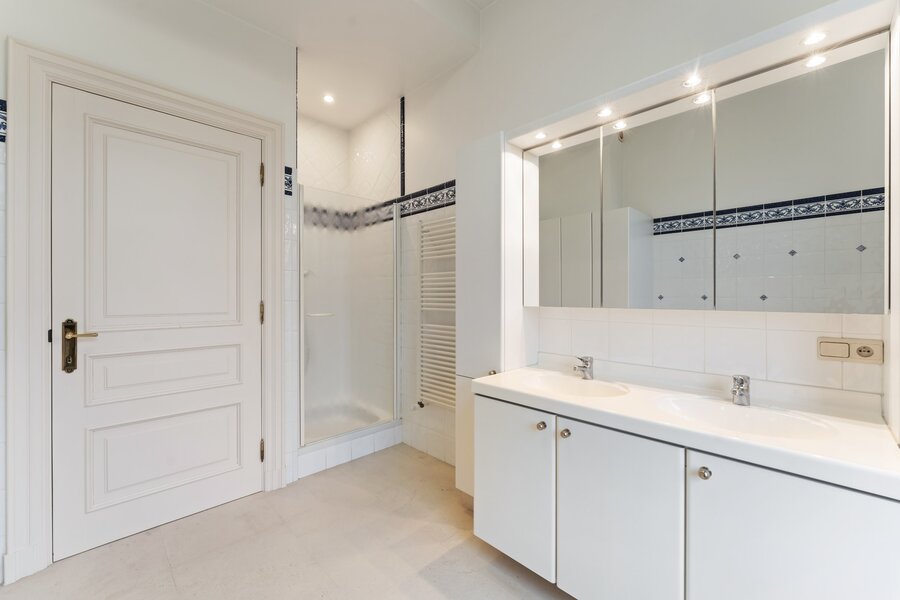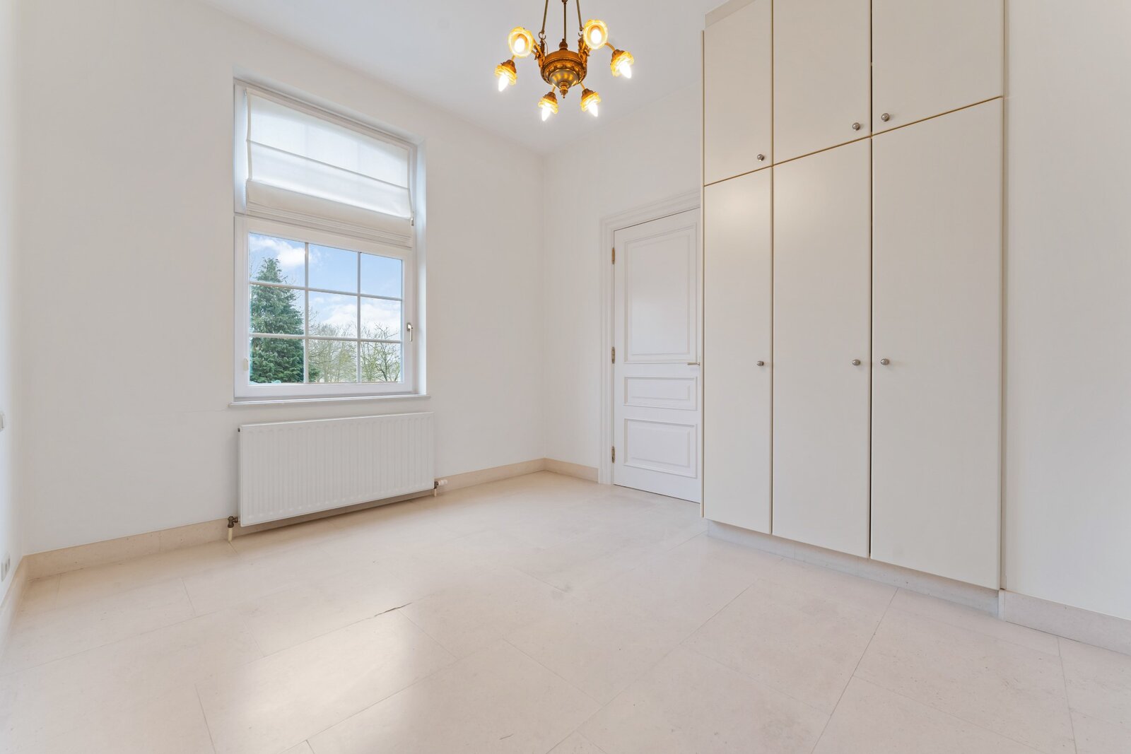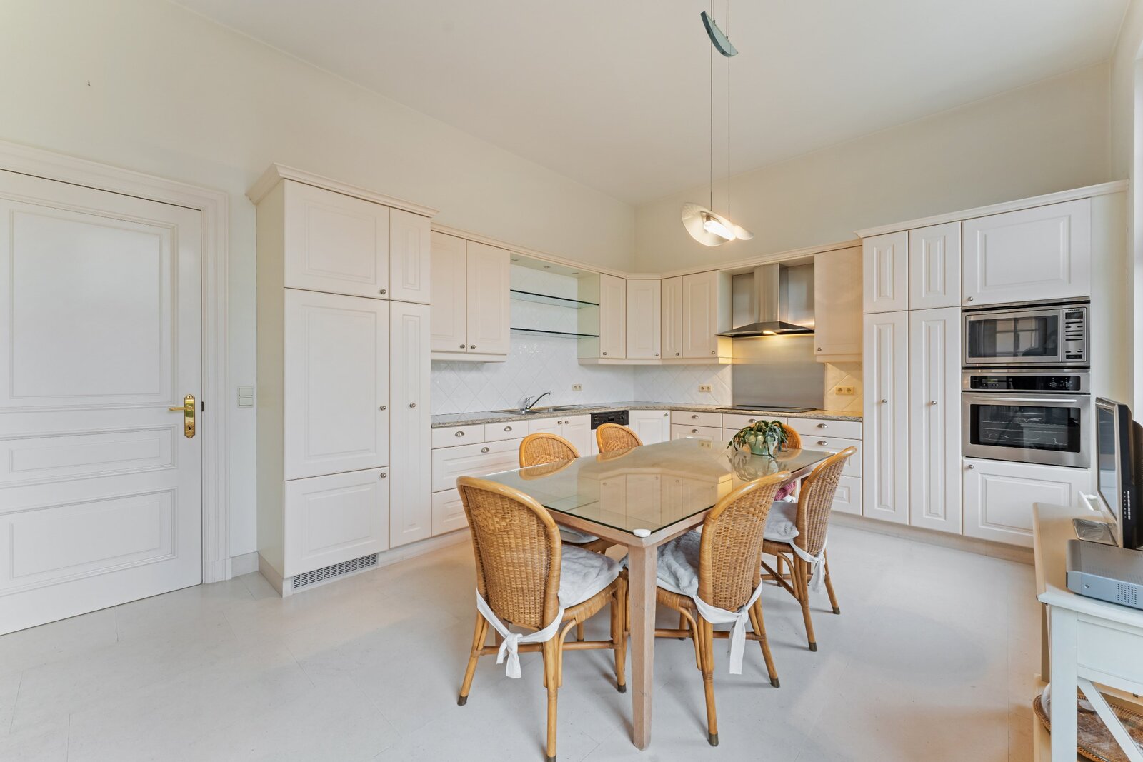 Le premier étage est accessible par l'imposant escalier du hall d'entrée ou par l'ascenseur. Le palier donne accès à des toilettes séparées, deux chambres et à la pièce de vie avec kitchenette. On y trouve également la troisième chambre avec salle de bains attenante (douche, toilettes). À cet étage, il y a une troisième salle de bains, équipée d'une baignoire, d'une douche et d'un double lavabo. Chaque chambre est équipée de grands placards.
