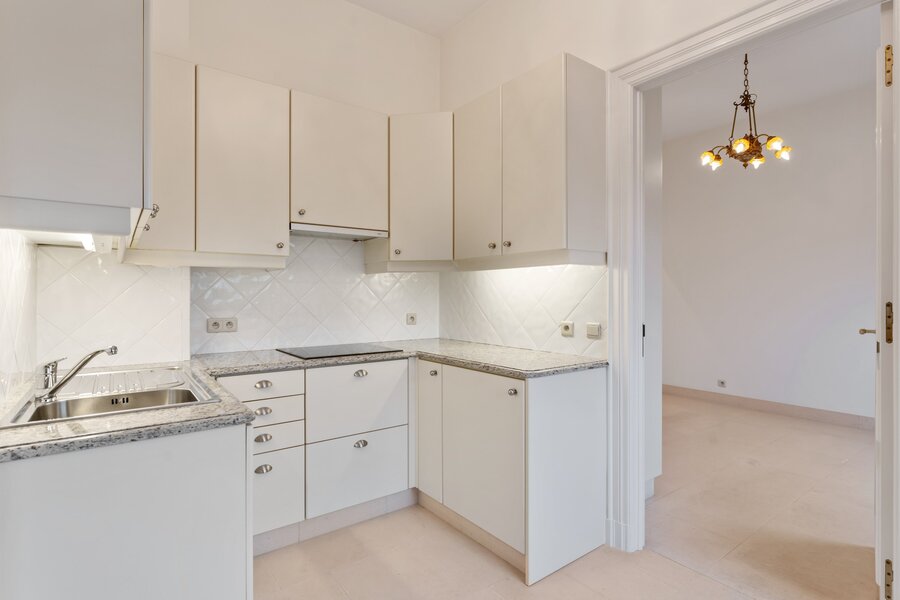 La cuisine est située à l'arrière et est équipée d'une plaque de cuisson, d'une hotte, d'un lave-vaisselle, d'un réfrigérateur, d'un four, d'un micro-ondes et de nombreux espaces de rangement. À côté, vous trouverez un coin salon confortable, situé entre le salon et la cuisine, offrant également une belle vue sur le jardin aménagé.