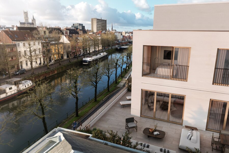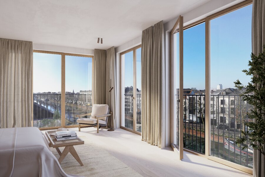 Gelegen aan de Ferdinand Lousbergskaai vinden we deze luxueuze duplex penthouse in een kleinschalig architecturaal project met 2 exclusieve appartementen met bijzonder ruime terrassen en 3 stadswoningen omringd door groen.