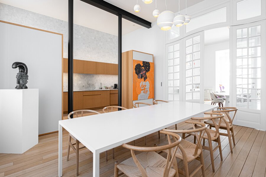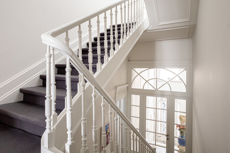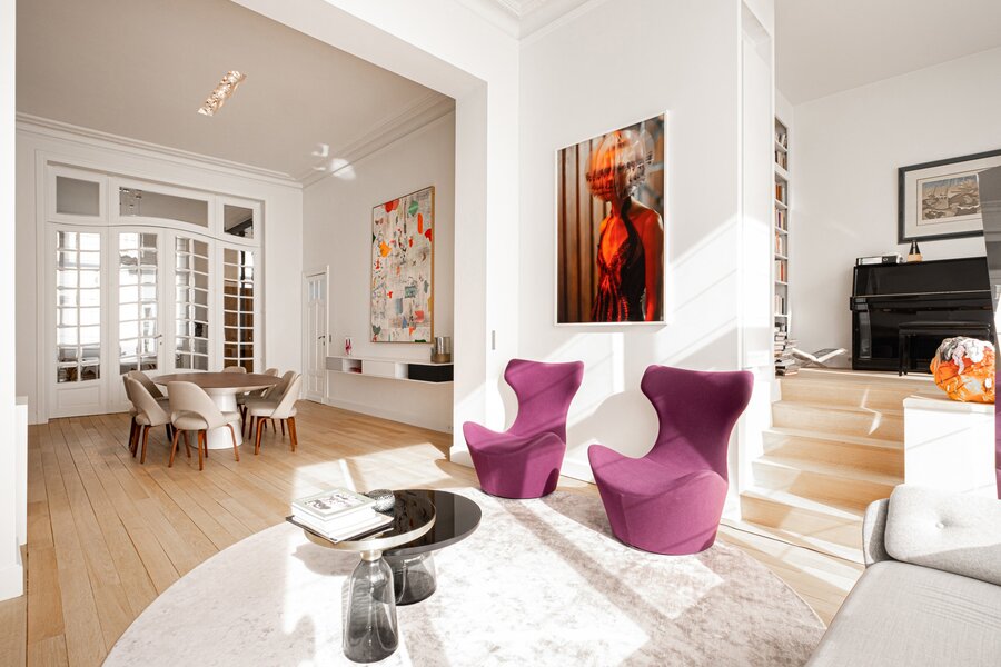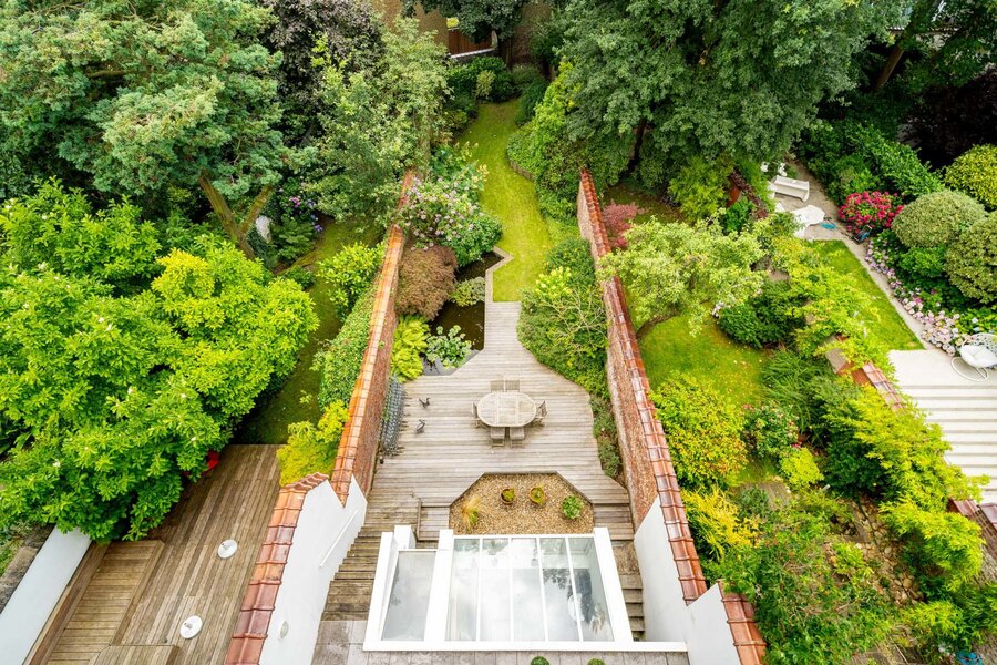 Le hall d'entrée vous mène vers le rez-de-chaussée, idéal pour une profession libérale, anciennement consacré à un cabinet dentaire (± 110m²). Le 1er étage accueille les spacieuses réceptions composées d'un double salon avec feu ouvert et un coin lecture, une cuisine ouverte sur la salle à manger, le tout sous une belle hauteur de plafond de plus de 4 mètres. Au 2eme étage, l'espace parental est composé d'une belle chambre avec dressing en bois de palissandre et d'une salle de bain donnant sur une terrasse et d'une petite chambre bébé ou bureau. Au 3e étage, le grenier a été aménagé en 2 chambres se partageant une salle de douche. Au sous-sol, une grande pièce polyvalente avec kitchenette et accès au jardin, un large garage, une buanderie et des caves.