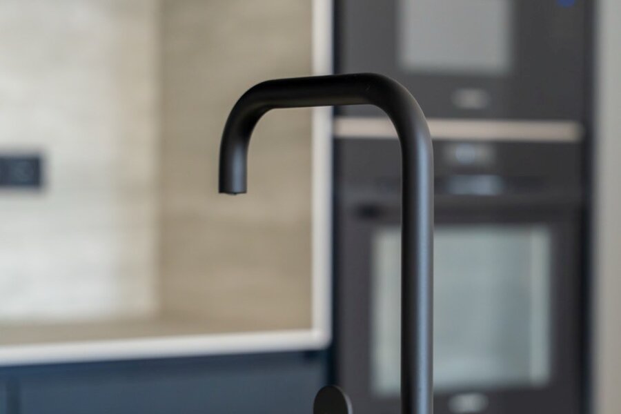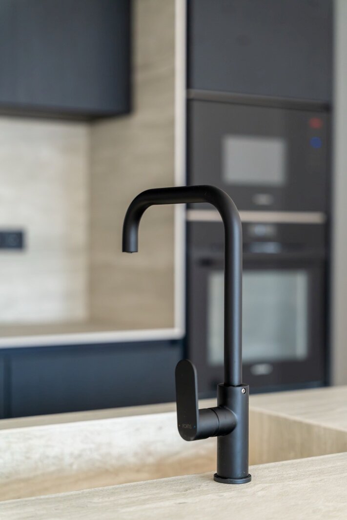 La cuisine ouverte s’intègre au séjour et comprend un mobilier en bois foncé, un plan de travail et une crédence en pierre, un îlot central avec évier intégré et robinetterie noire, ainsi que des électroménagers Siemens encastrés.