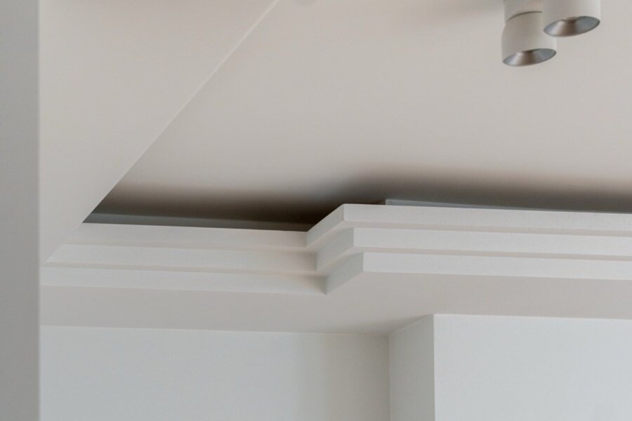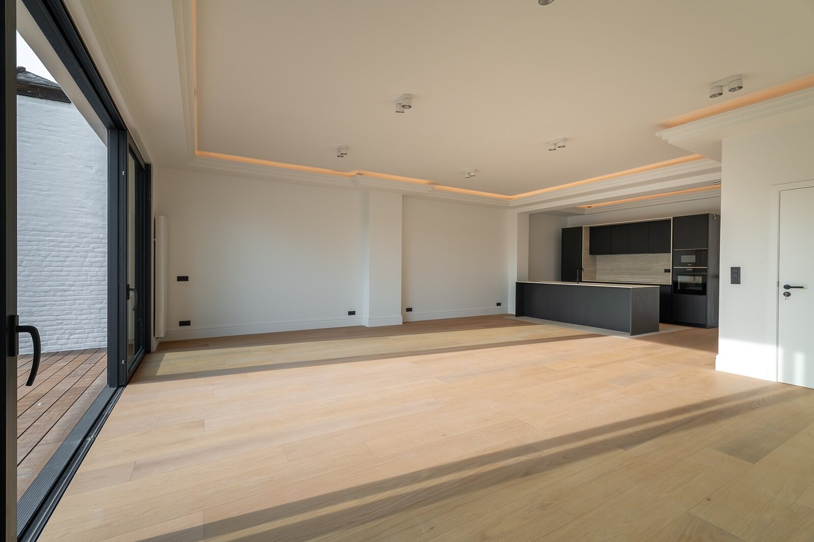 Le séjour, prolongé par de larges baies vitrées, donne accès à la terrasse orientée plein sud. Les moulures au plafond structurent les volumes et accompagnent les lignes de l’espace. Le sol est en parquet en chêne.