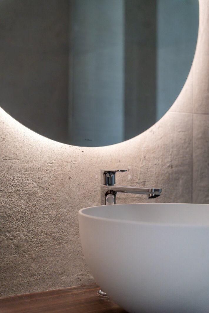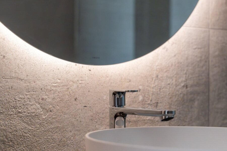 L’entrée se fait par un hall qui distribue d’un côté l’espace de vie et le WC invités, et de l’autre la partie nuit.
