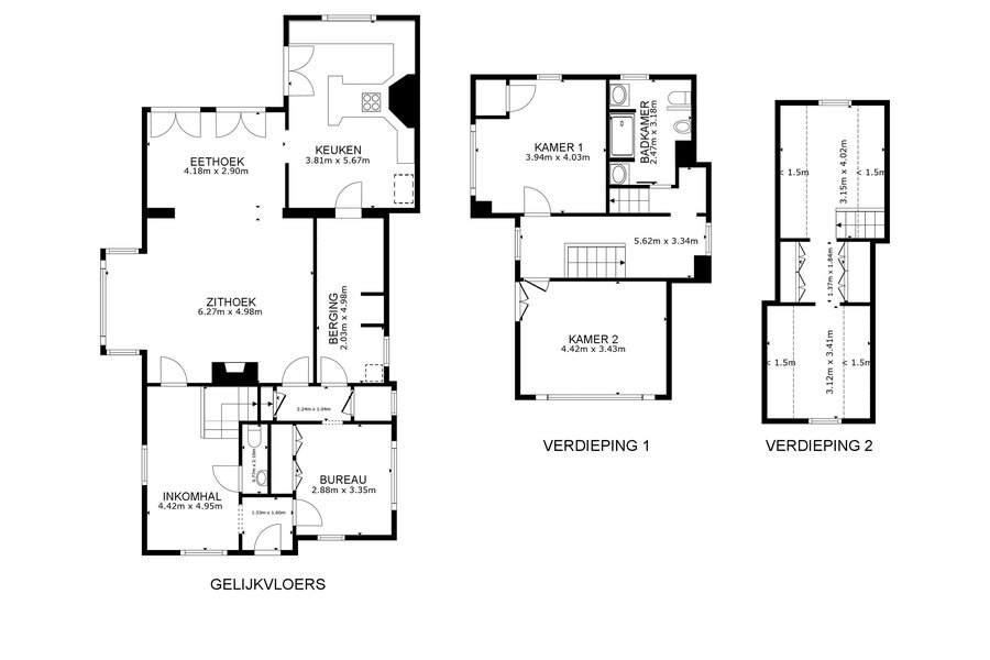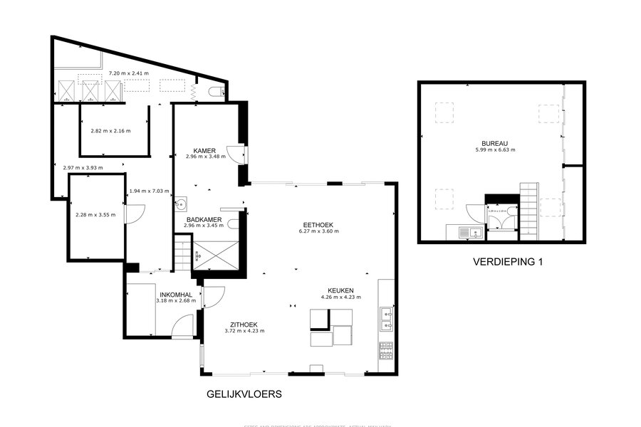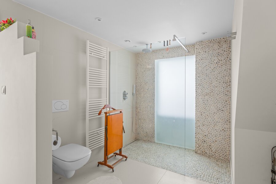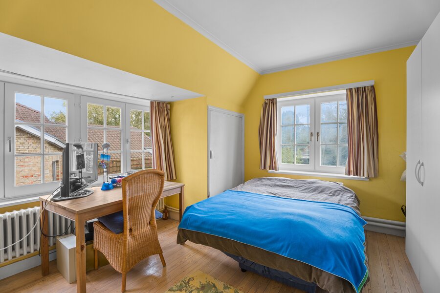 De hoofdwoning verwelkomt u via een ruime inkomhal met gastentoilet en leidt naar de lichtrijke leefruimte met open keuken, volledig gericht naar de zonnige tuin. Verder beschikt u over een authentieke badkamer/wasruimte en een bureau. Op de eerste verdieping bevinden zich twee ruime slaapkamers en een badkamer, terwijl de zolder een polyvalente ruimte of bijzondere kinderkamer biedt.