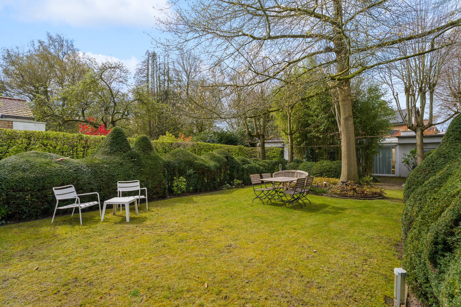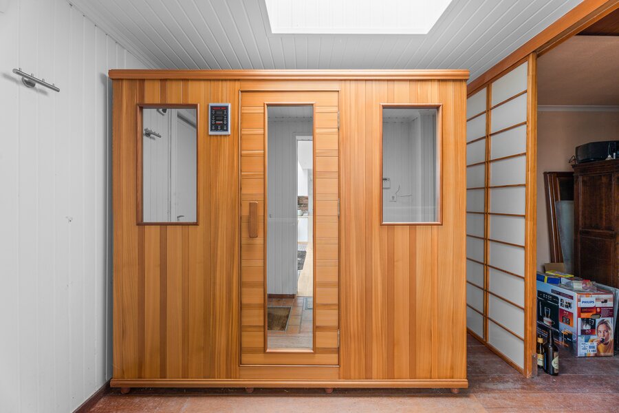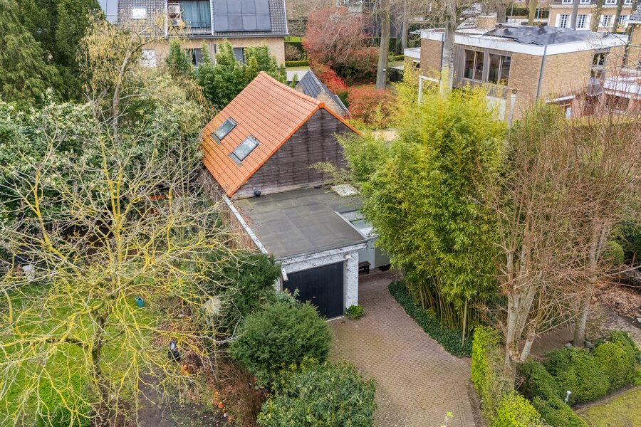 Achteraan de tuin bevindt zich het absolute surplus: een bijgebouw met leefruimte, slaapkamer, badkamer, kantoorinrichting, wellness (spa & sauna) én een afgesloten garage.