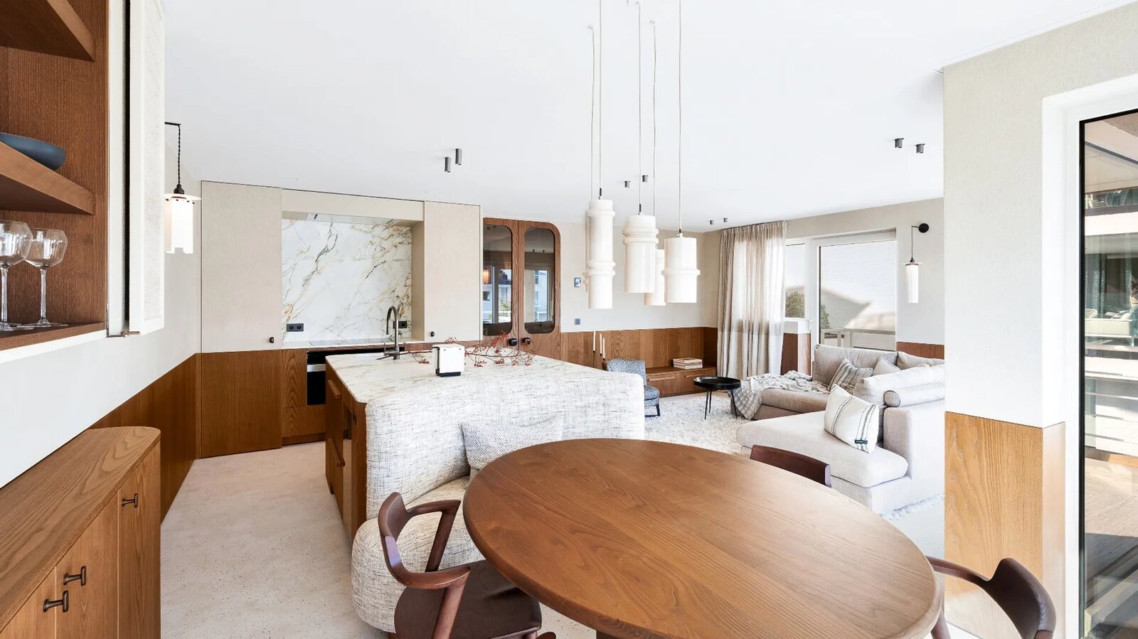 Un hall d'entrée élégant avec vestiaire et toilettes invités vous accueille dans l'appartement. Le salon lumineux est doté d'un luxueux îlot de cuisine ouvert en marbre et est équipé de tous les appareils électroménagers (Miele) dont un réfrigérateur à vin. L'appartement dispose à l'arrière de deux chambres à coucher complètes, chacune avec sa propre salle de bains ou salle de douche. Troisième chambre à coucher avec un lit pour une personne. Connexion pour machine à laver et sèche-linge.