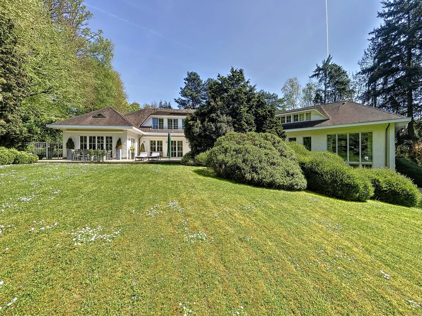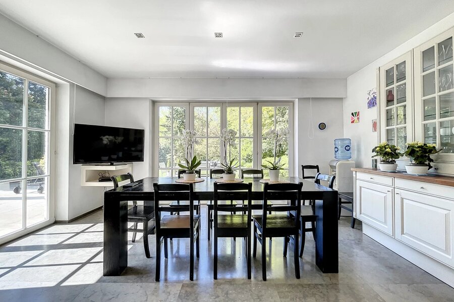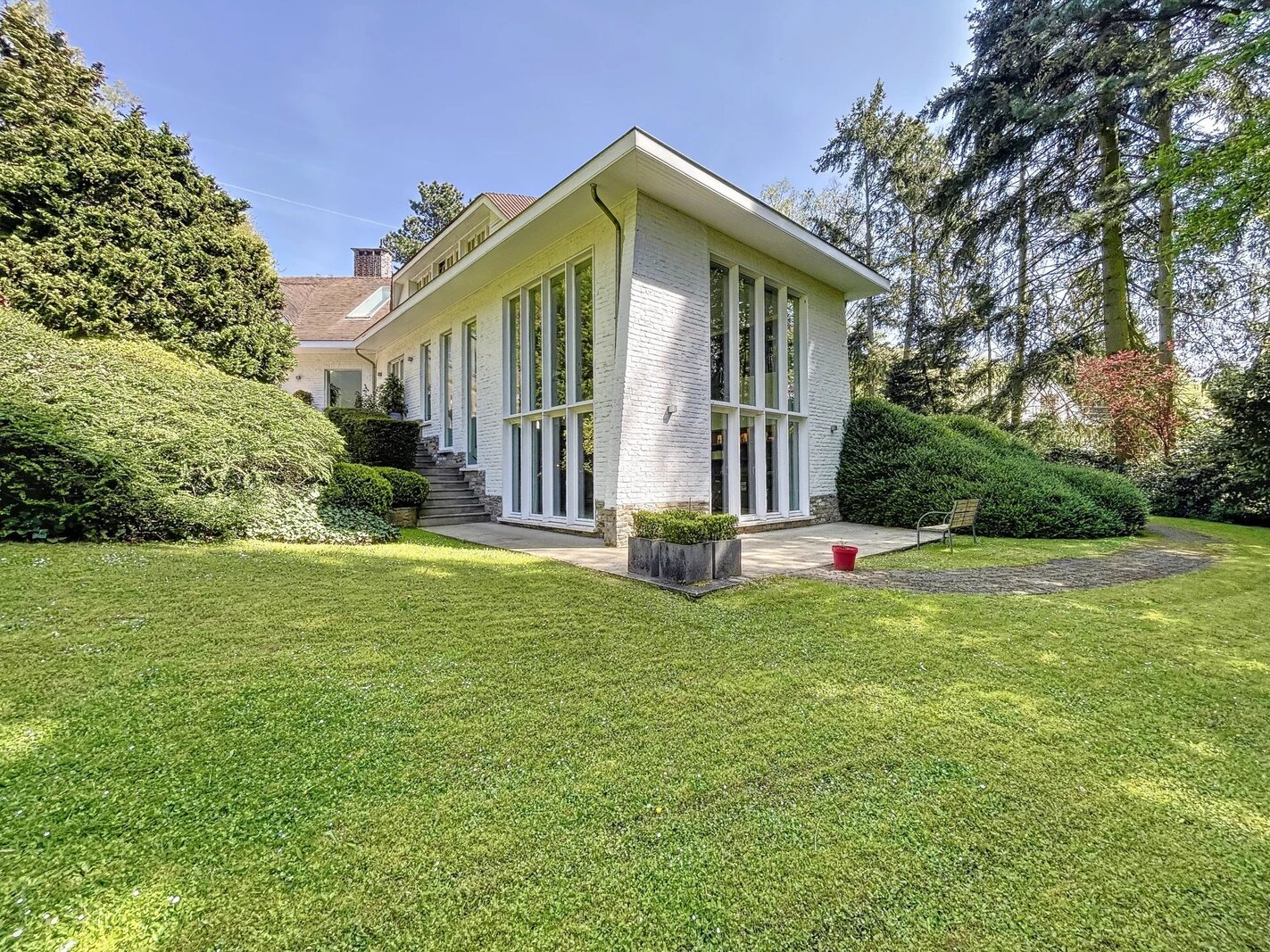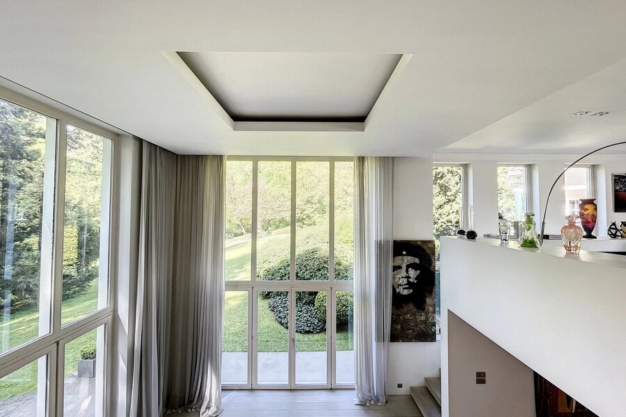 Déployée sur une superficie brute habitable de 765 m² (source PEB) et nichée au cœur d’un terrain magnifiquement arboré de 56 ares orienté plein sud, cette propriété conjugue avec élégance art de vivre, volumes rares et lumière omniprésente.