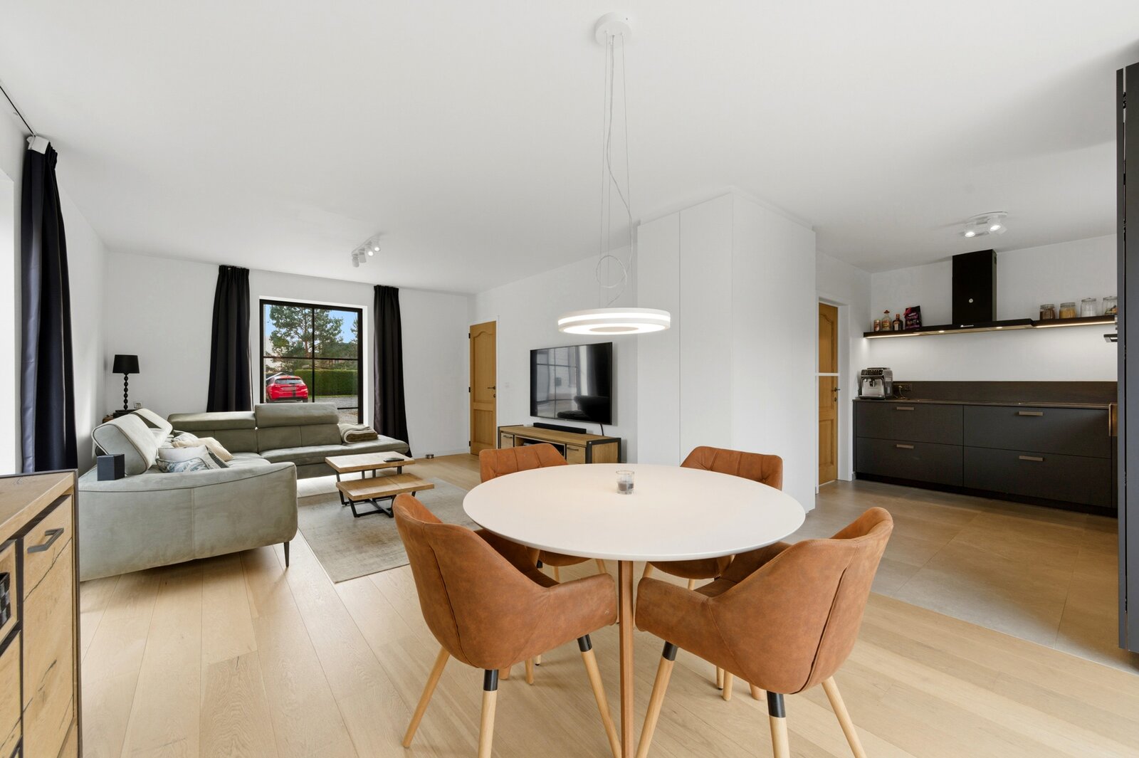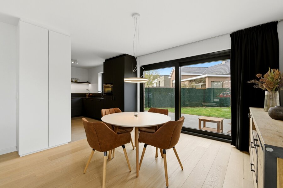 U komt binnen via de inkomhal met een apart gastentoilet. Vervolgens betreedt u de grote leefruimte met raampartijen die zorgen voor een mooie natuurlijke lichtinval. Hier is er voldoende ruimte voor een gezellige zithoek én een eethoek met zicht op de tuin.