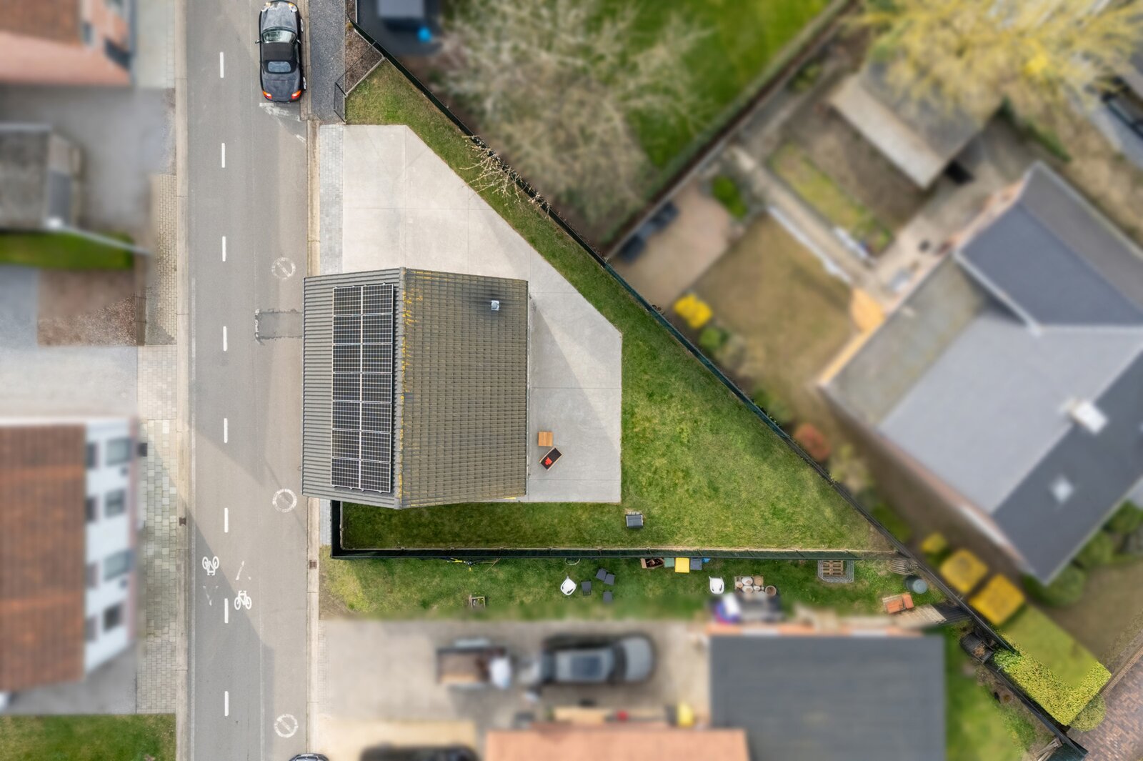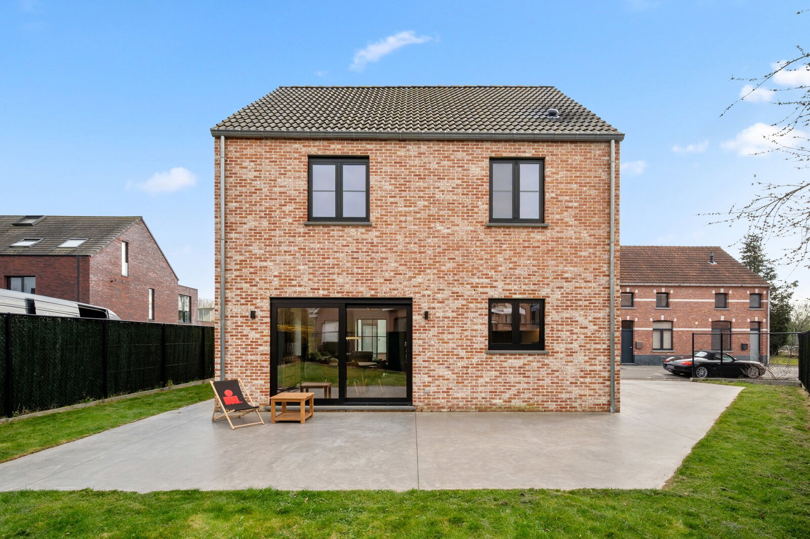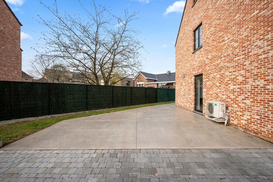 Achteraan de woning is er een terras met tuin en aan de linkerzijde van de woning is er parkeerruimte voor twee auto's met mogelijkheid tot plaatsen van carport of garage.