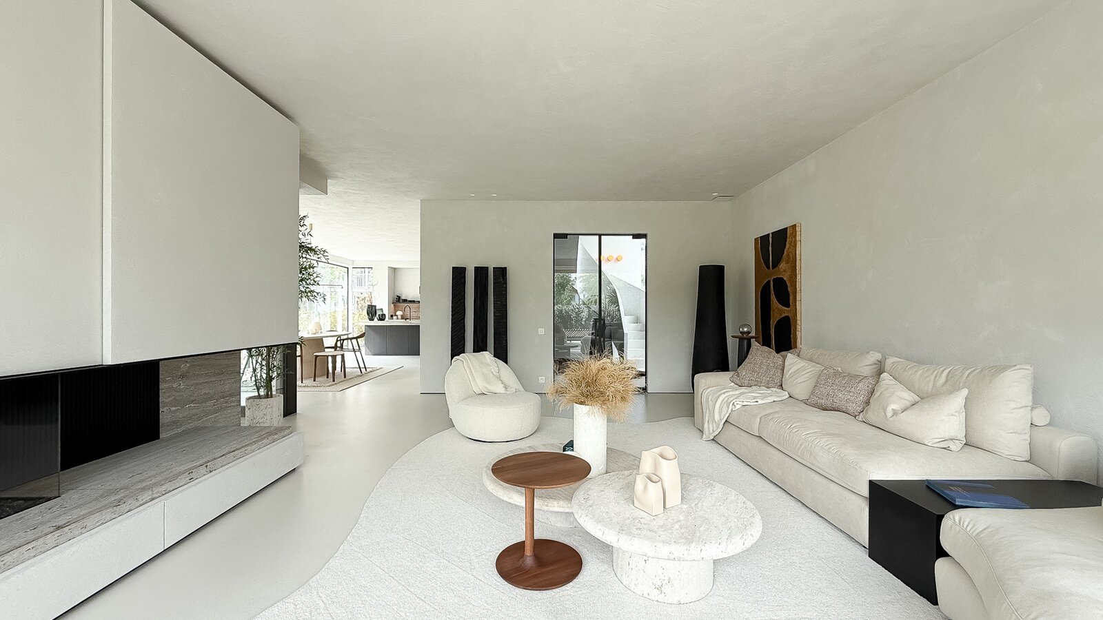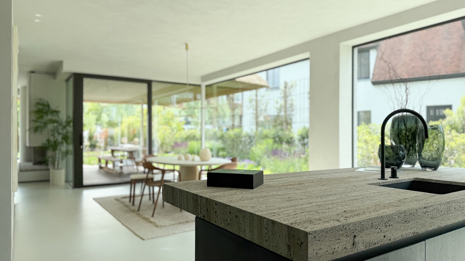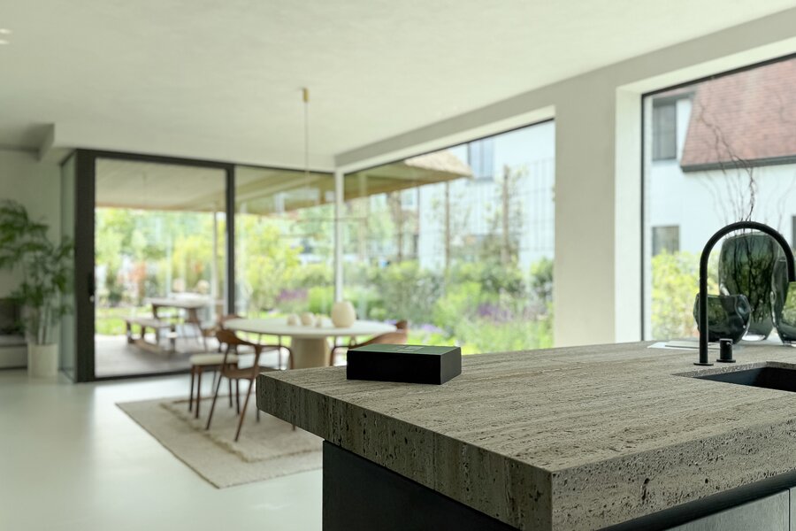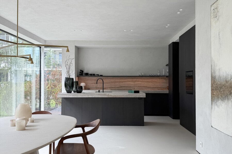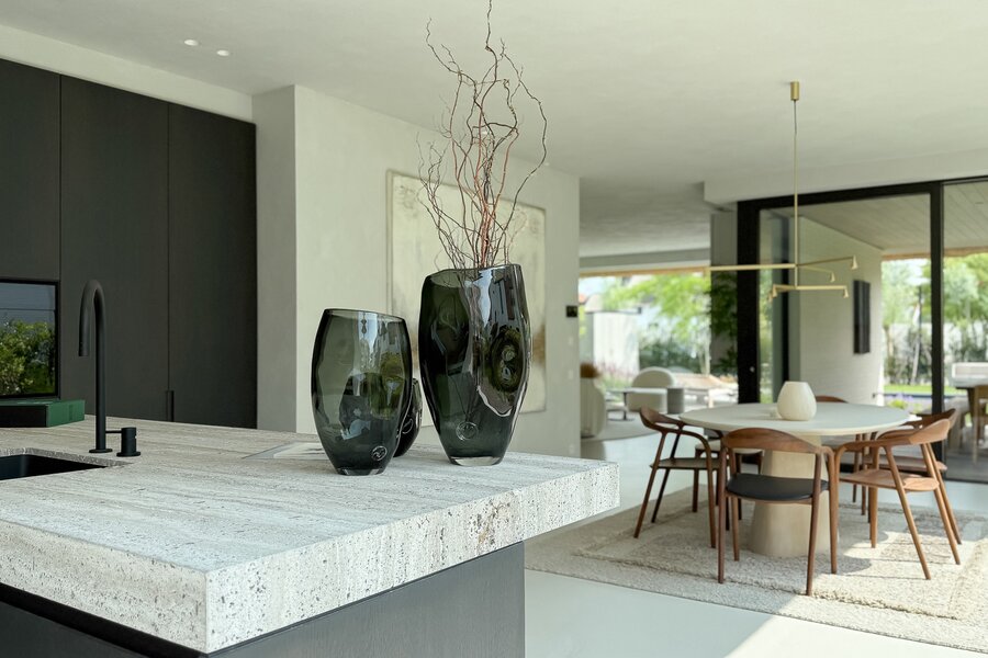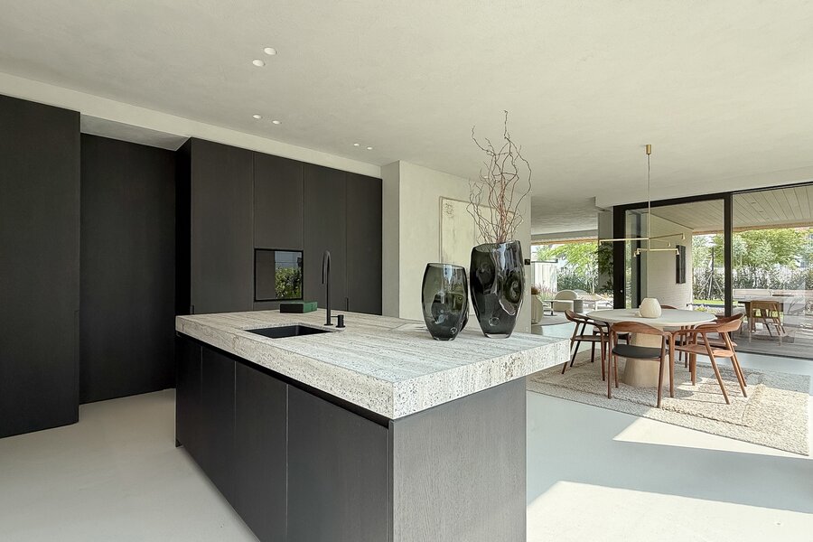 La cuisine ouverte, au design sobre et sophistiqué, est équipée d’un îlot central en pierre naturelle et d’électroménagers de haute qualité. Une arrière-cuisine pratique dissimule toutes les installations techniques tout en offrant des rangements supplémentaires. Le sol de la maison est revêtu d’un béton coulé de qualité supérieure, écologique et insonorisant, qui confère à l’ensemble une atmosphère homogène, moderne et élégante.