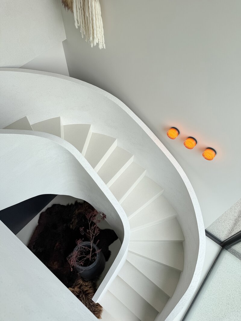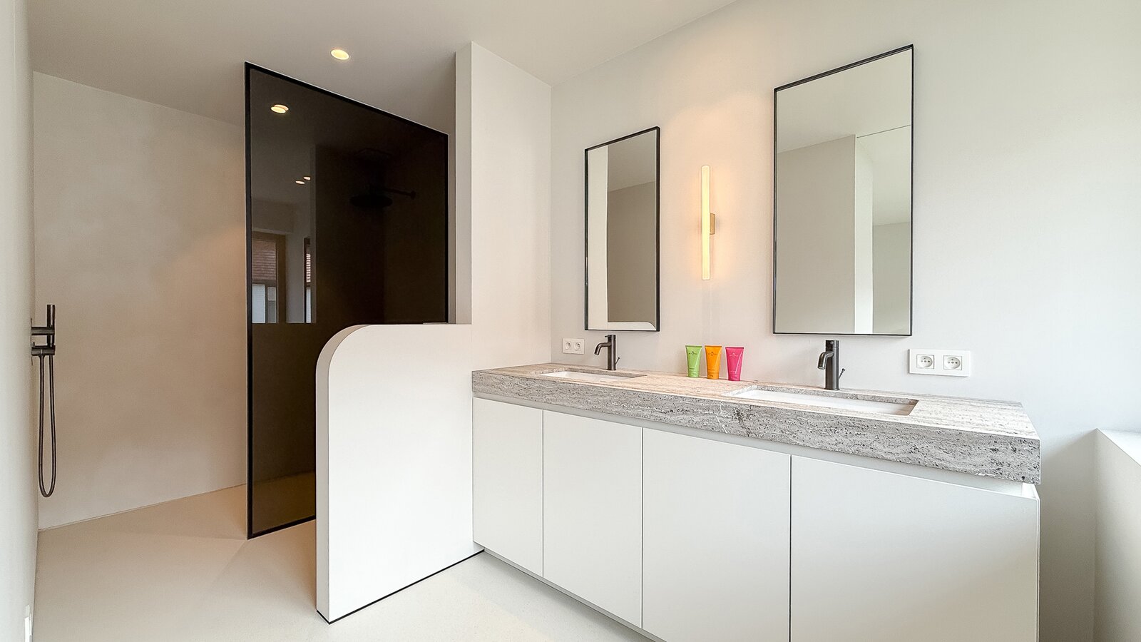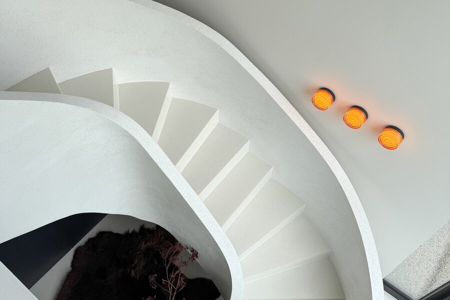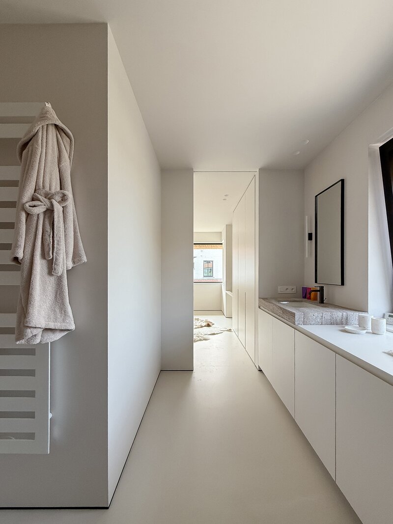 La cuisine ouverte, au design sobre et sophistiqué, est équipée d’un îlot central en pierre naturelle et d’électroménagers de haute qualité. Une arrière-cuisine pratique dissimule toutes les installations techniques tout en offrant des rangements supplémentaires. Le sol de la maison est revêtu d’un béton coulé de qualité supérieure, écologique et insonorisant, qui confère à l’ensemble une atmosphère homogène, moderne et élégante.