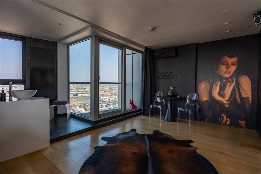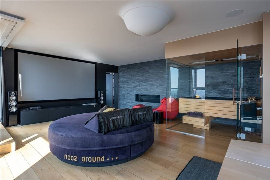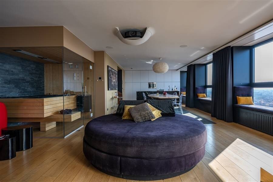 L'appartement dispose d'un espace de bien-être privé avec sauna, hammam et jacuzzi, chacun offrant une vue panoramique. L'appartement comprend également deux chambres à coucher avec salle de bains privative. La chambre principale offre un luxe supplémentaire avec sa propre terrasse, l'air conditionné et le multimédia intégré.