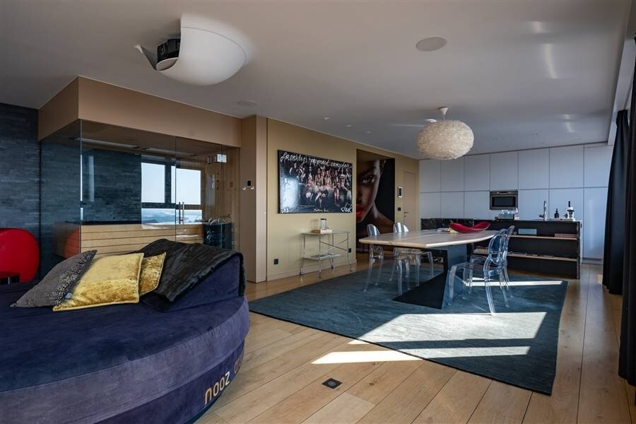Grâce au système domotique, vous pouvez facilement contrôler l'éclairage, la musique et les images dans tout l'appartement.