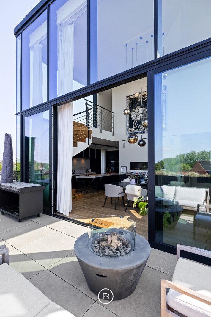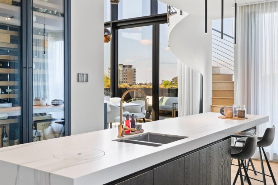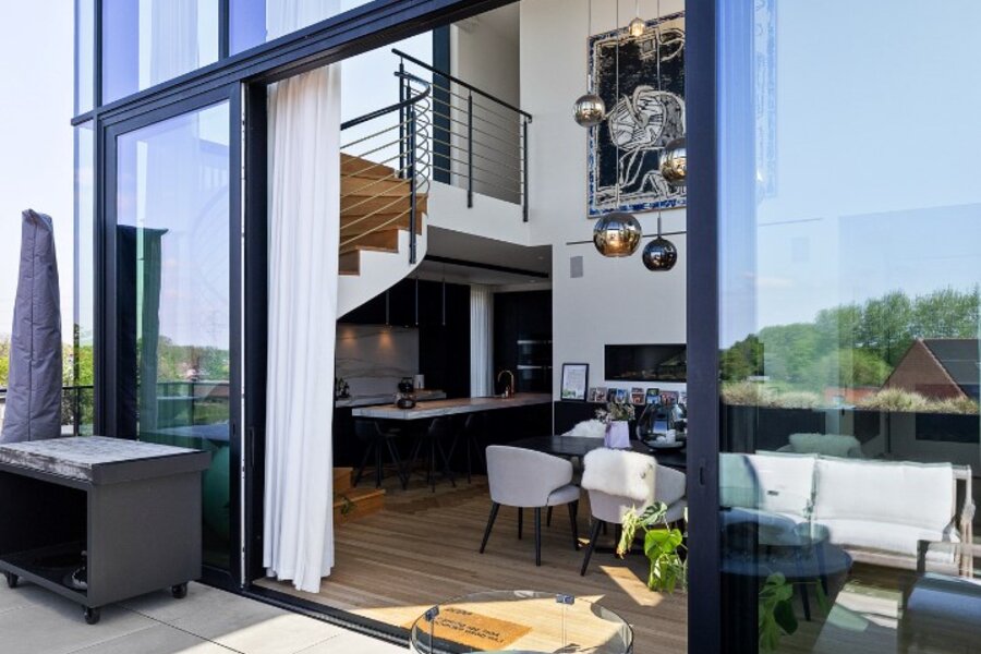 L'espace de vie dégage classe et chaleur, notamment grâce à deux élégantes cheminées et une cuisine ouverte de haute qualité avec îlot de cuisson. Le penthouse est entièrement équipé de chauffage par le sol associé à une pompe à chaleur écoénergétique, garantissant un confort maximal et un climat intérieur agréable et constant.