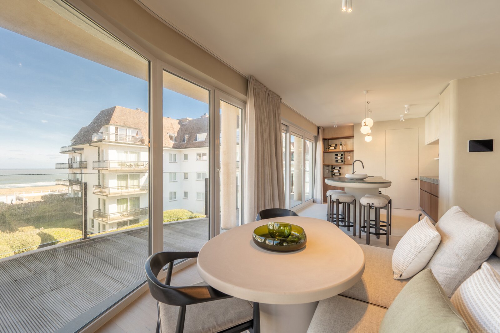 Le séjour et la cuisine donnent tous deux accès à une spacieuse terrasse offrant une vue imprenable sur la mer.