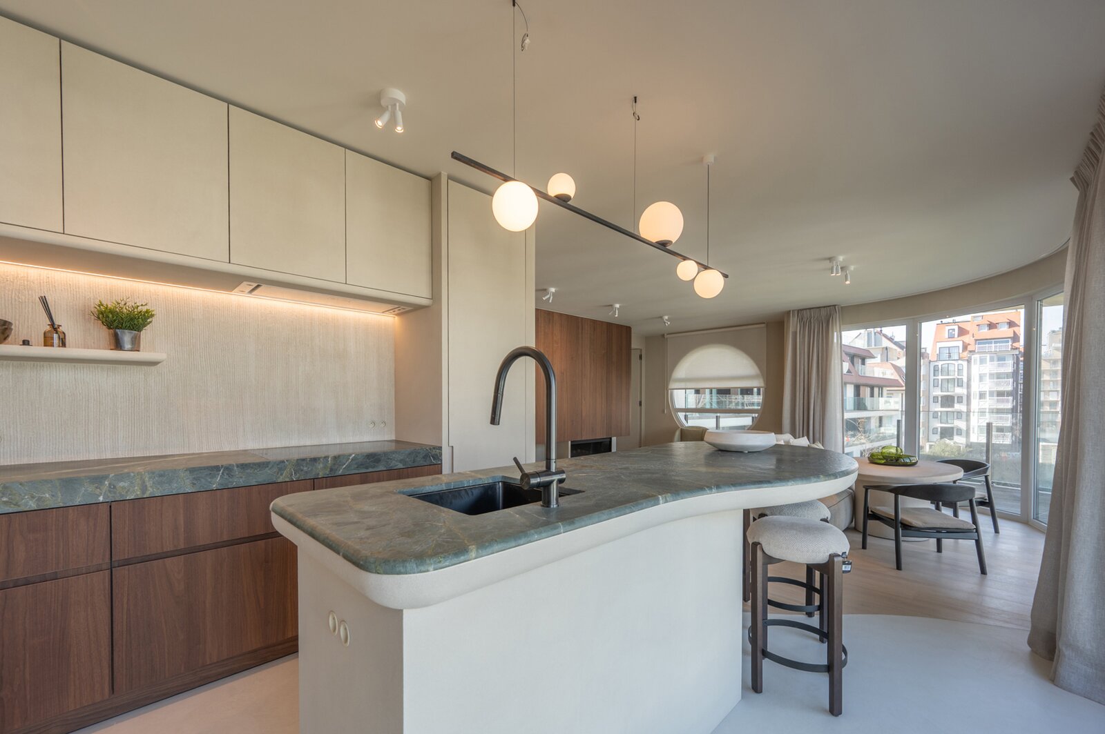 Le hall d’entrée élégant avec vestiaire et toilette invités mène vers un espace de vie lumineux comprenant un salon et une salle à manger, agrémentés d’un feu ouvert électrique. La cuisine ouverte, entièrement équipée avec des appareils haut de gamme, dispose également d’un agréable coin petit-déjeuner.
