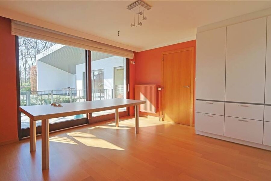 Bij het betreden van de woning komt u in een ruime inkomhal met vestiaire en gastentoilet. Het gelijkvloers biedt een aangename leefruimte met zithoek, ruime eetplaats en keuken, aangevuld met een wintertuin die een directe verbinding vormt met het terras en de tuin.