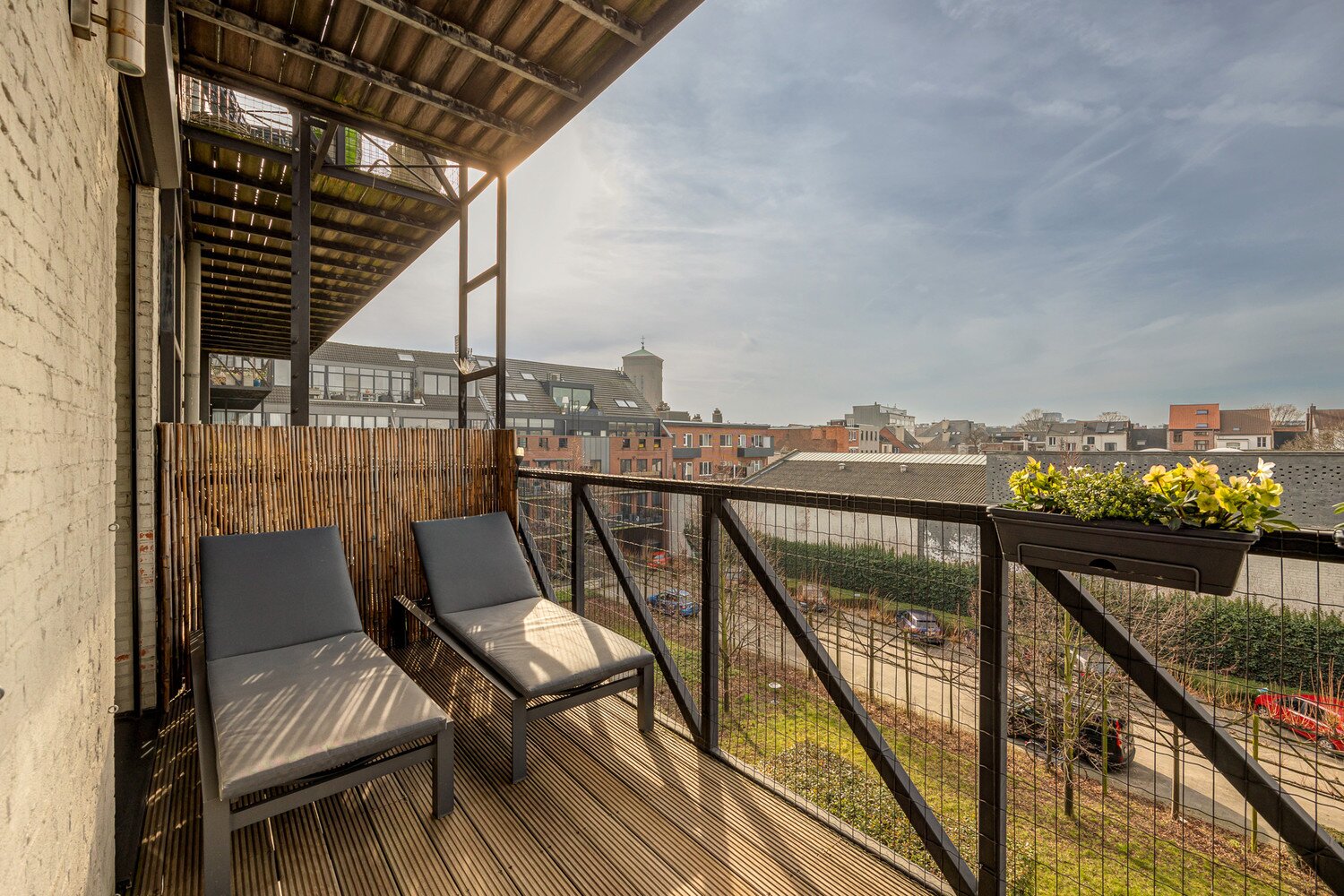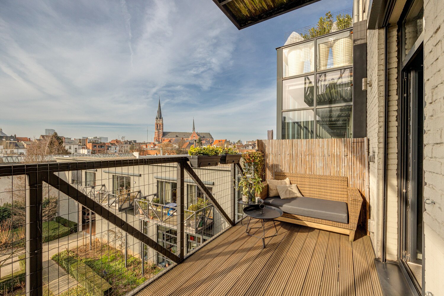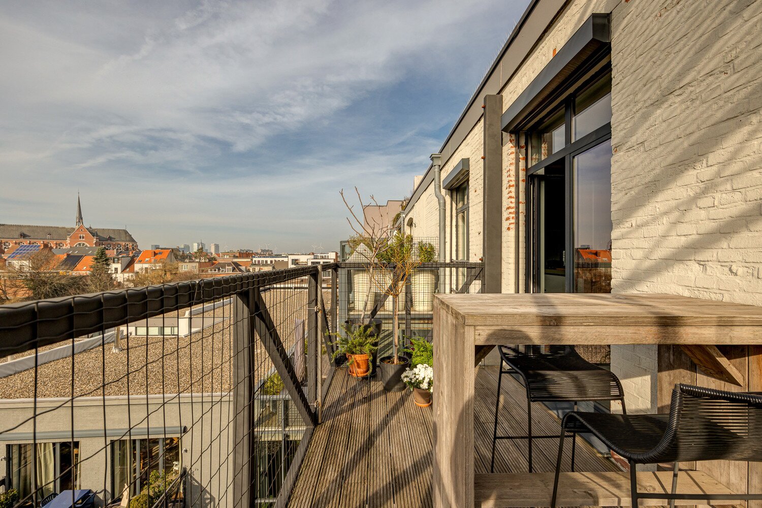 Op de bovenste verdieping treffen we een riante leefruimte van maar liefst 115 m² op een strakke en onderhoudsvriendelijke gietvloer met aansluitend een eerste zalige zonneterras van 12m². Van hieruit is het panoramisch zicht op de stad en het bijhorende lichtspel ronduit spectaculair te noemen - Mits het bekomen van de nodige vergunningen bestaat er de mogelijkheid om een dakterras te creëren van +/-100m²!