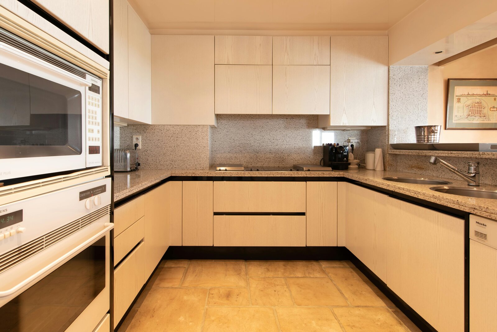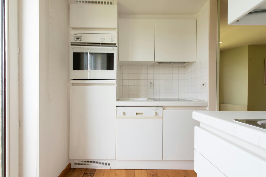 - salon lumineux (79m²) avec cuisine ouverte avec plaque vitrocéramique, four, micro-ondes, lave-vaisselle et réfrigérateur