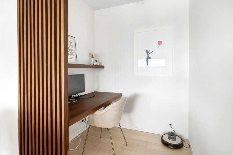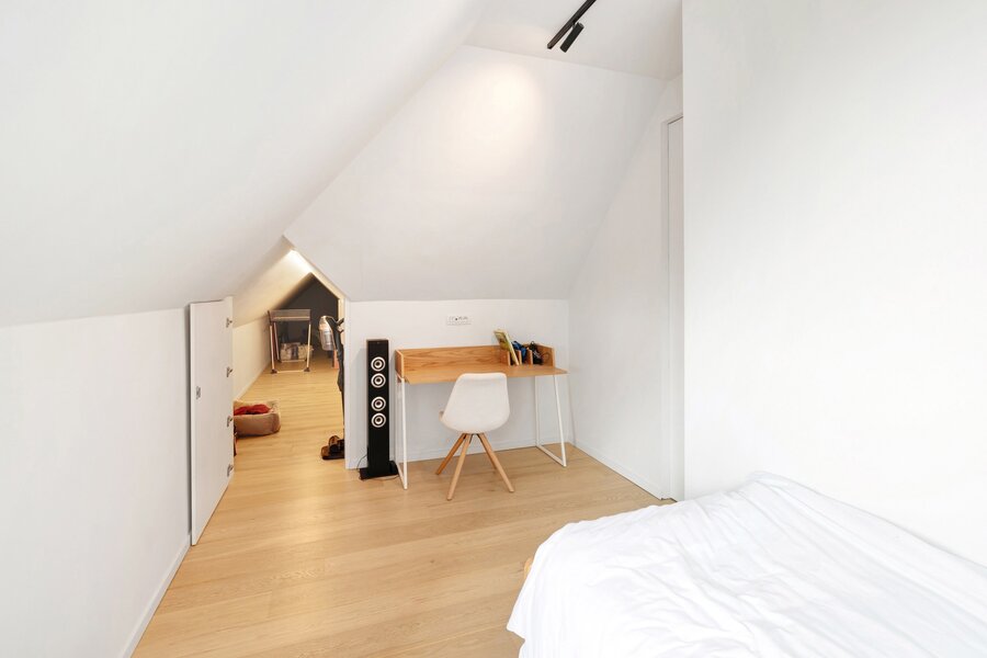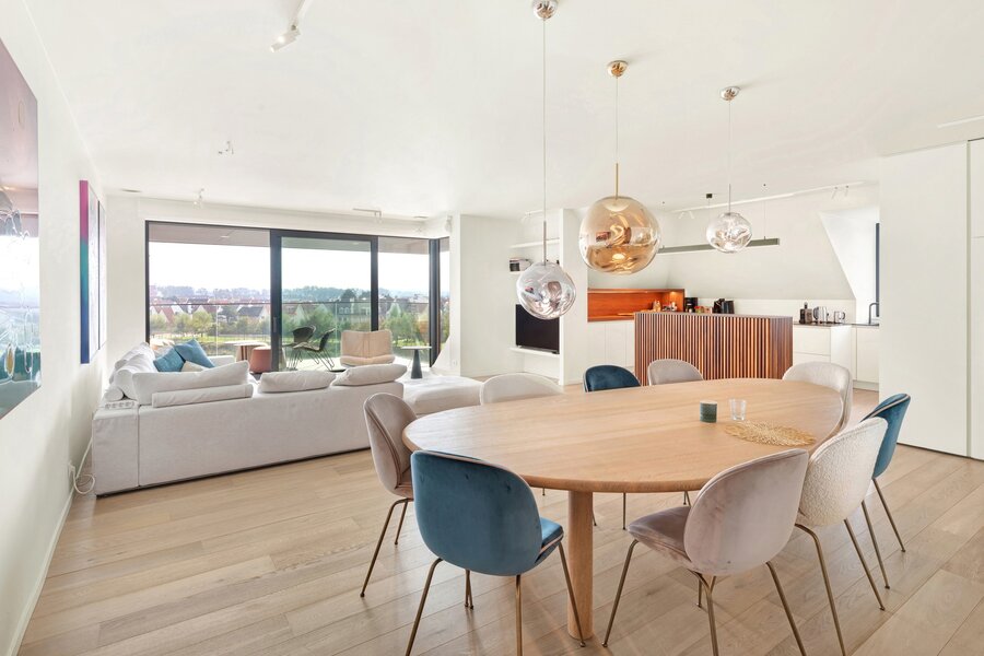 Le hall mène à un vaste séjour orienté plein sud (env. 50 m²) avec un coin bureau donnant sur une confortable terrasse extérieure de 11 m², également orientée plein sud.