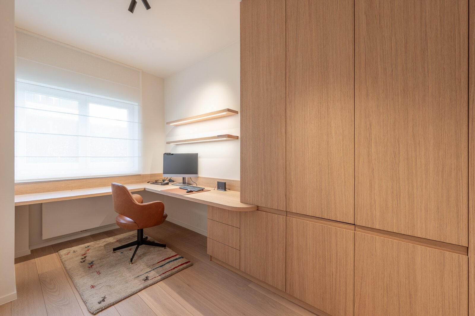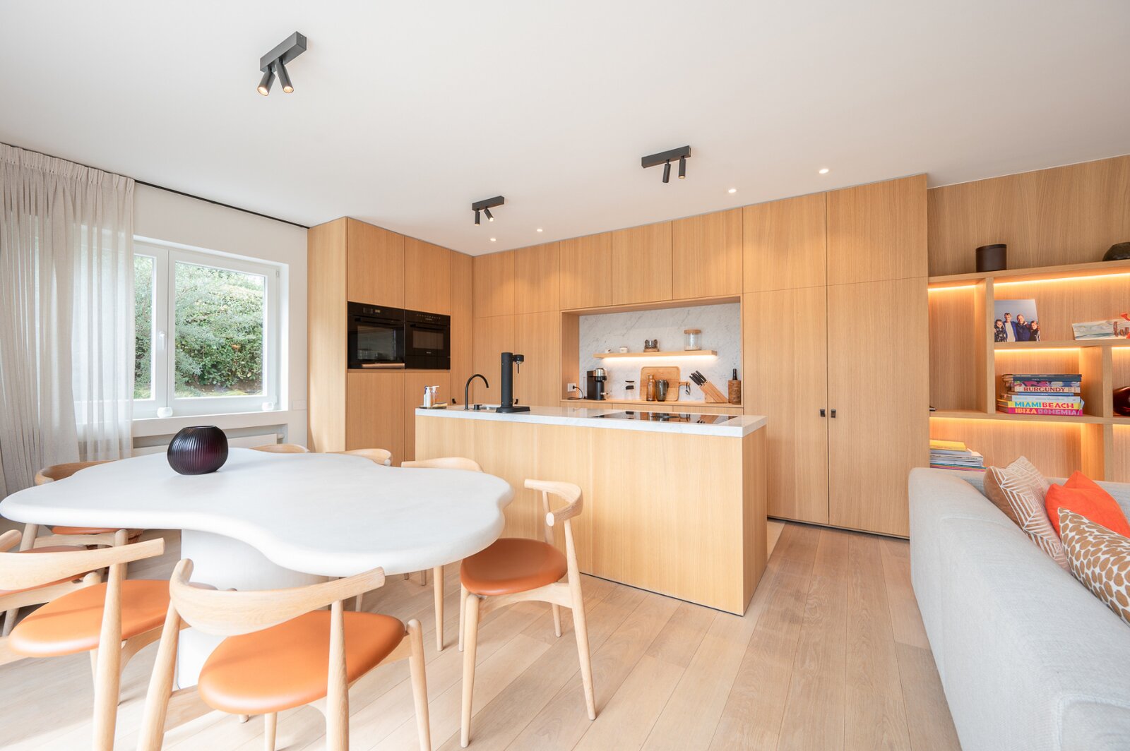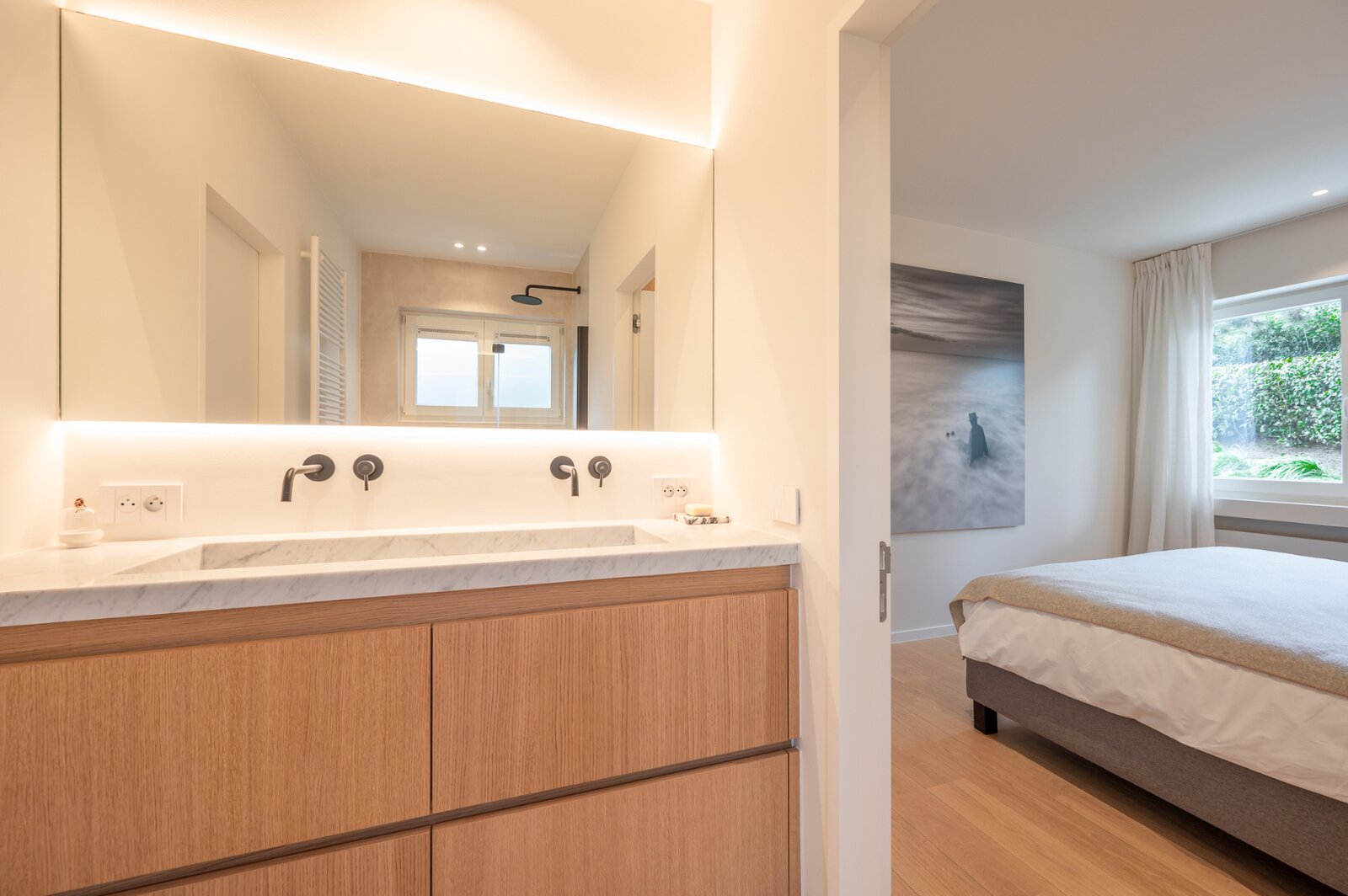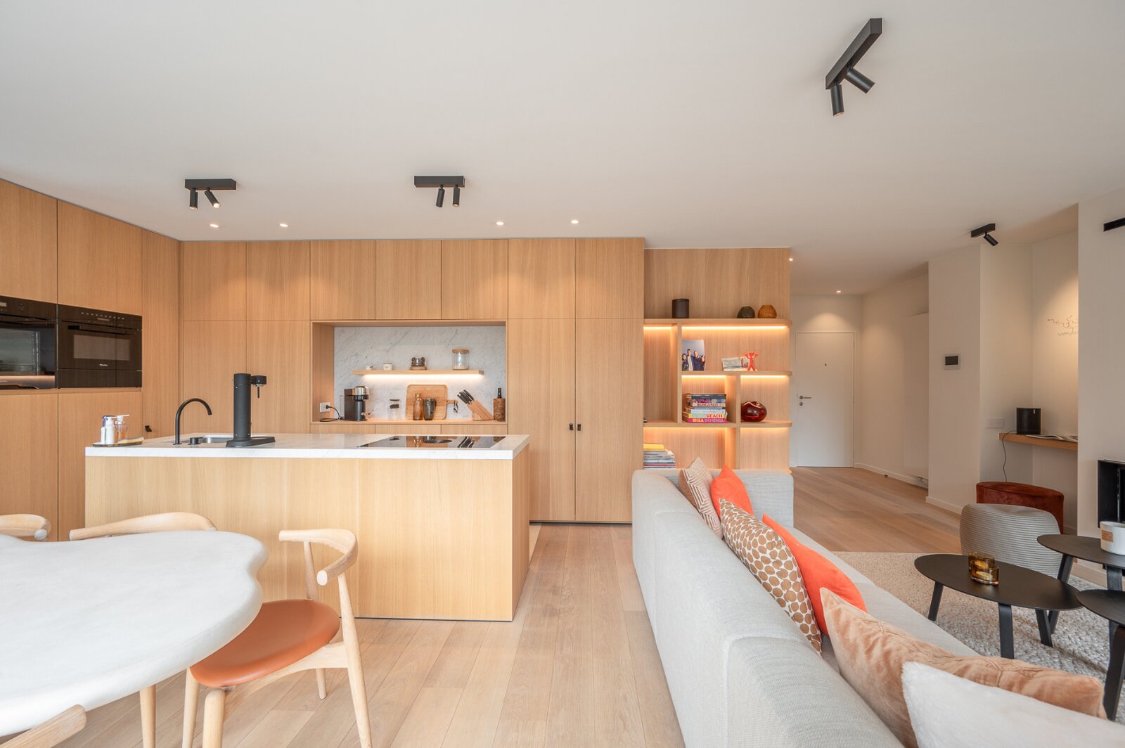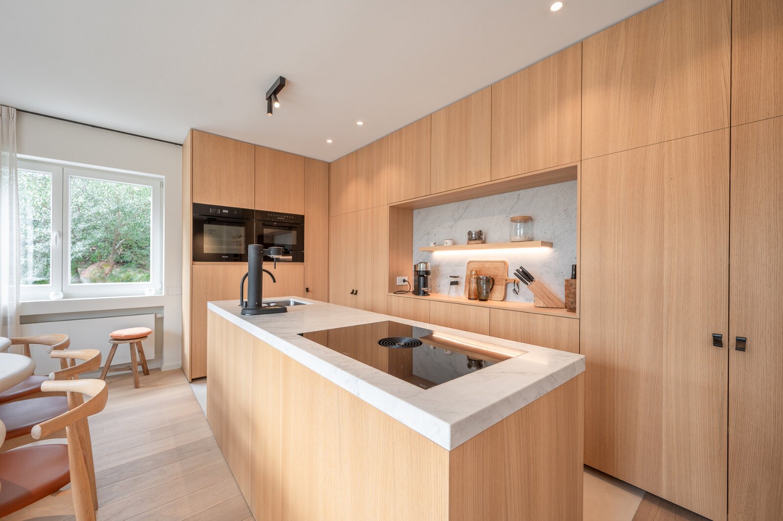 L'appartement a été aménagé avec des matériaux de haute qualité : armoires en placage de chêne, marbre de Carrare, béton ciré et parquet en chêne huilé. Domotique Bticino. Volets partout. Jardin conçu par Dominique Eeman avec arrosage automatique.