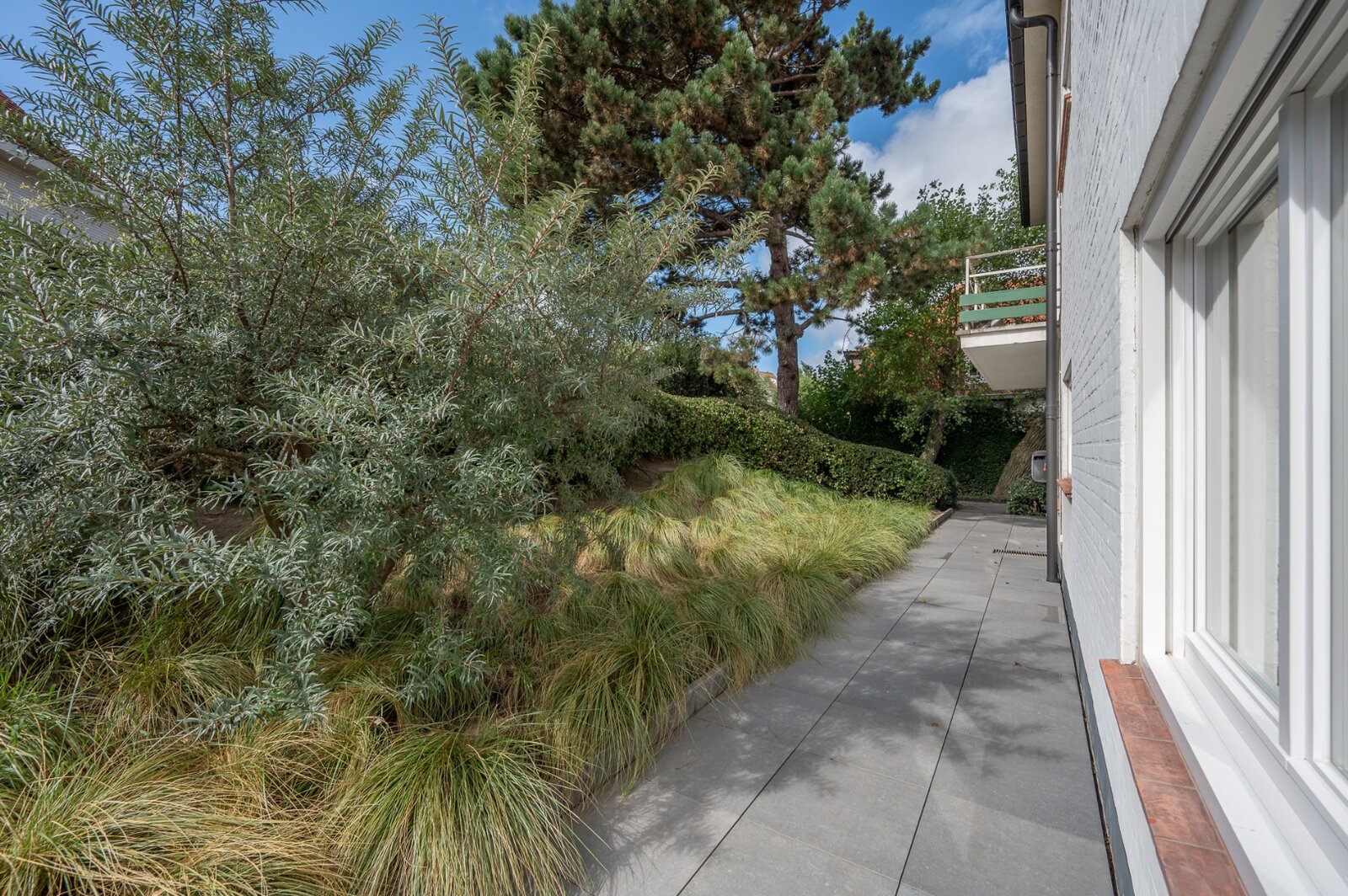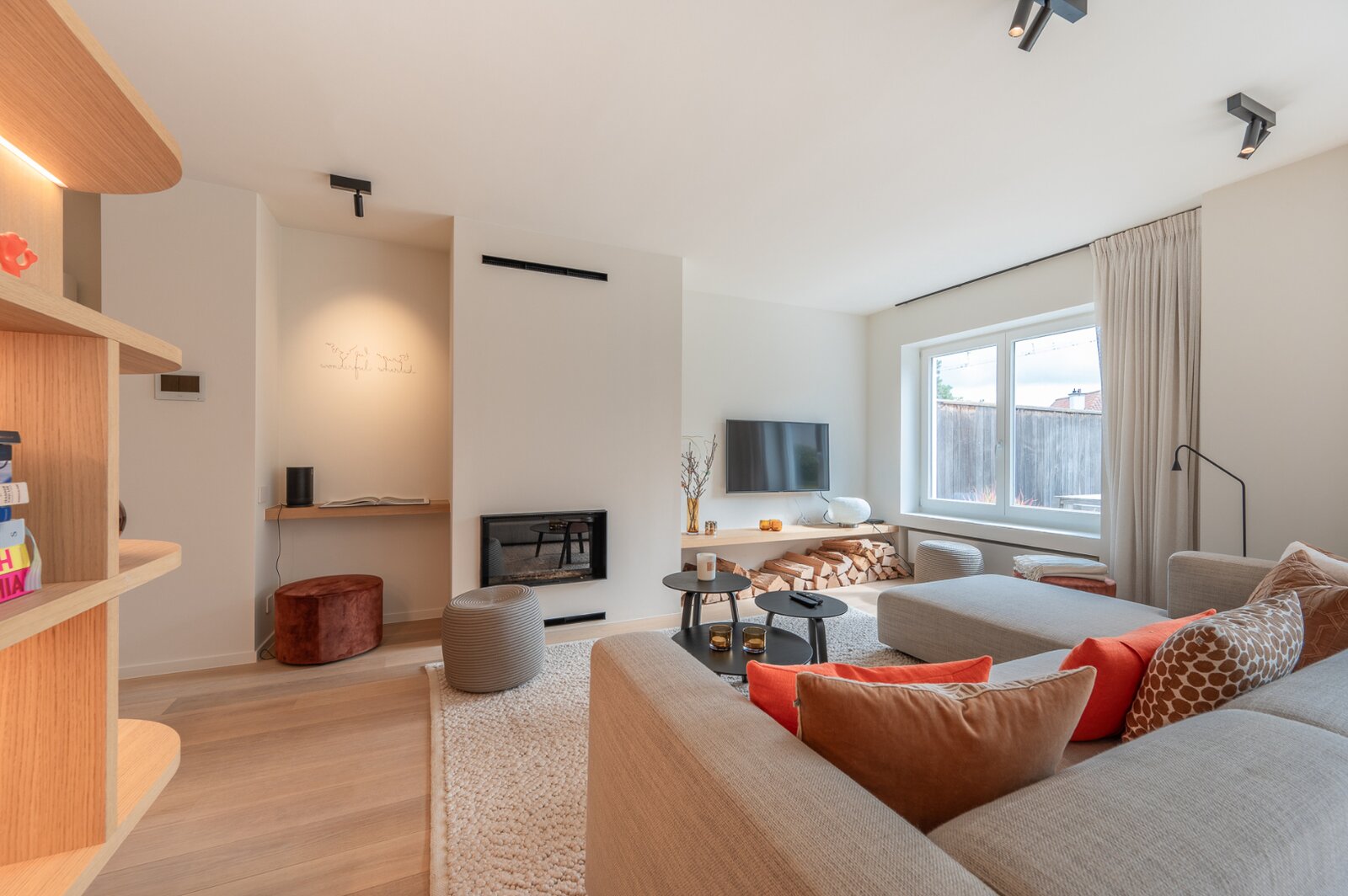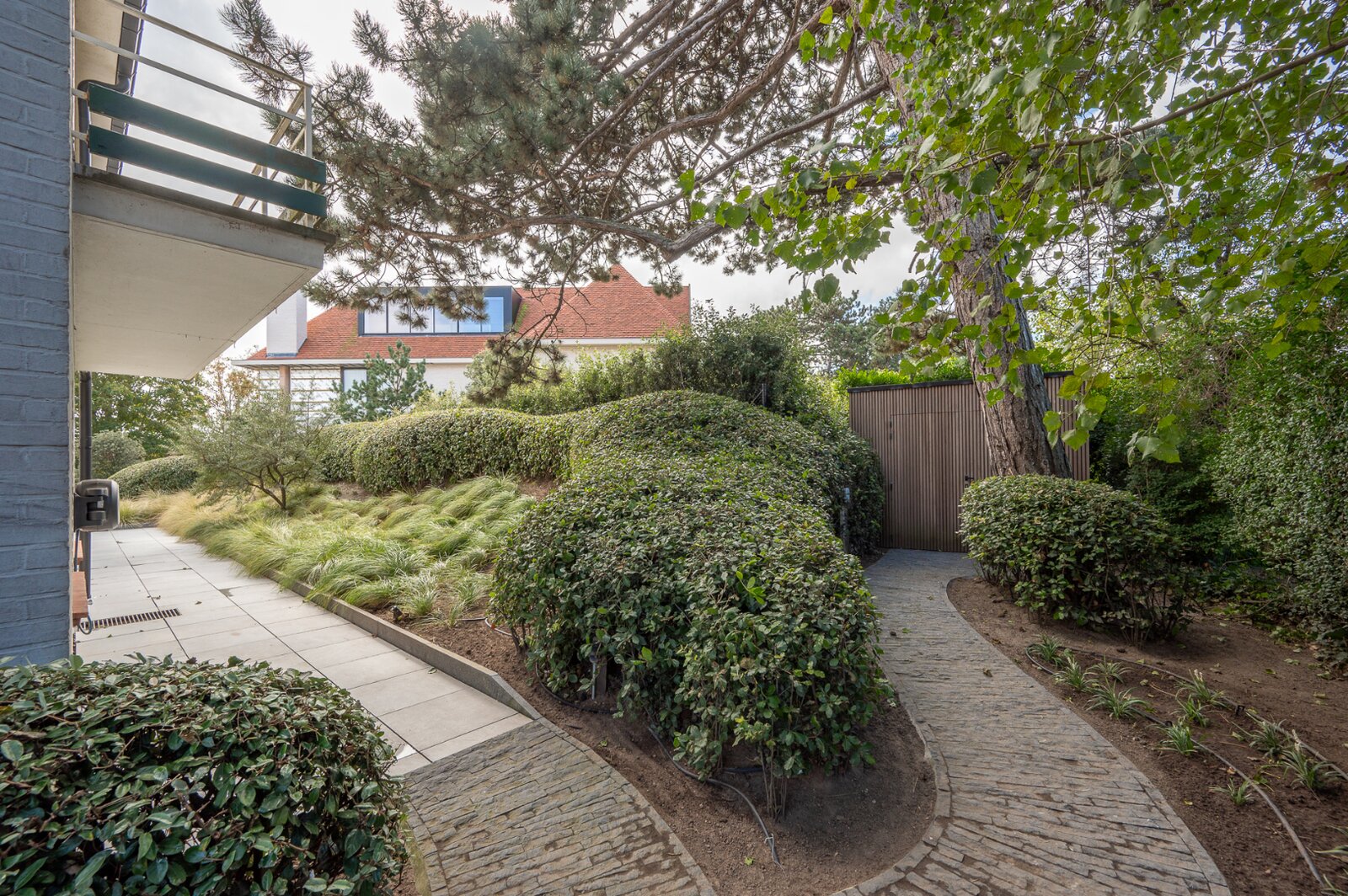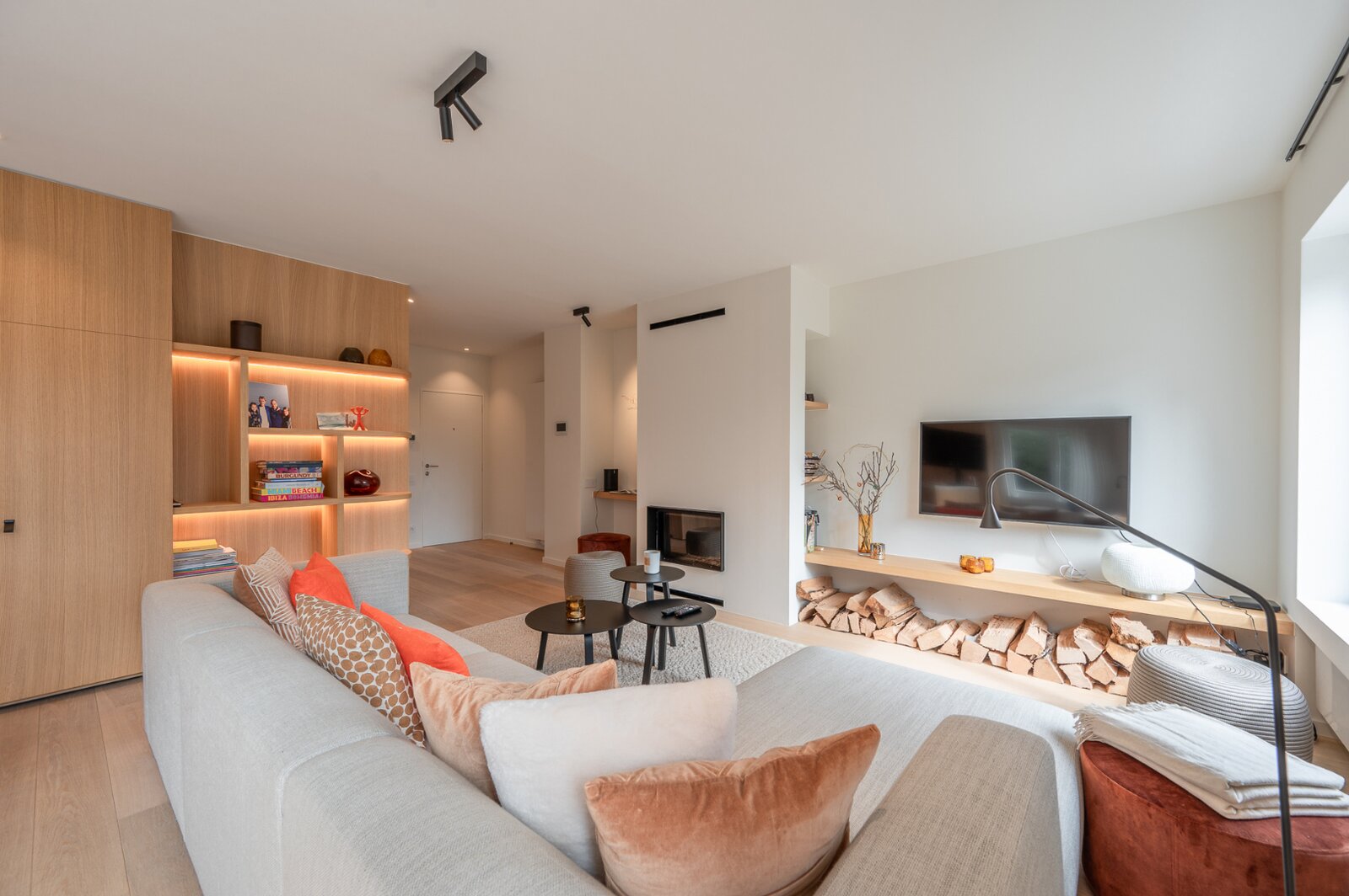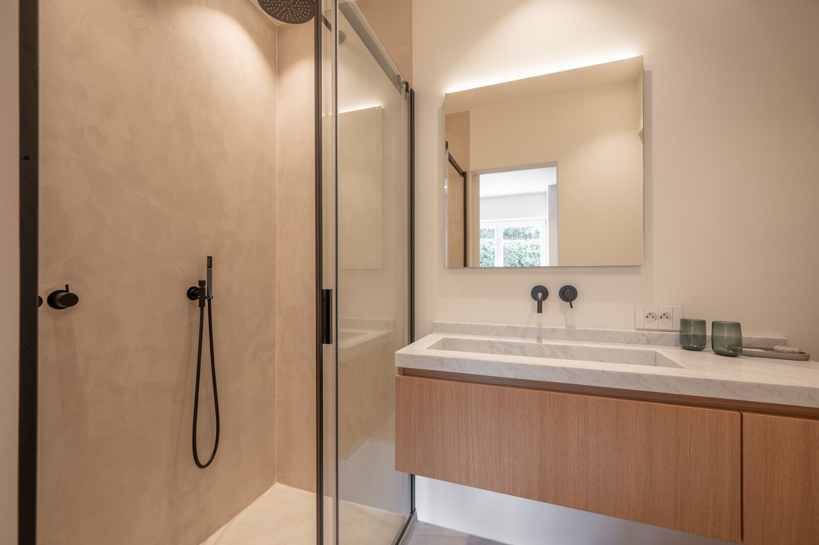L'appartement a été aménagé avec des matériaux de haute qualité : armoires en placage de chêne, marbre de Carrare, béton ciré et parquet en chêne huilé. Domotique Bticino. Volets partout. Jardin conçu par Dominique Eeman avec arrosage automatique.