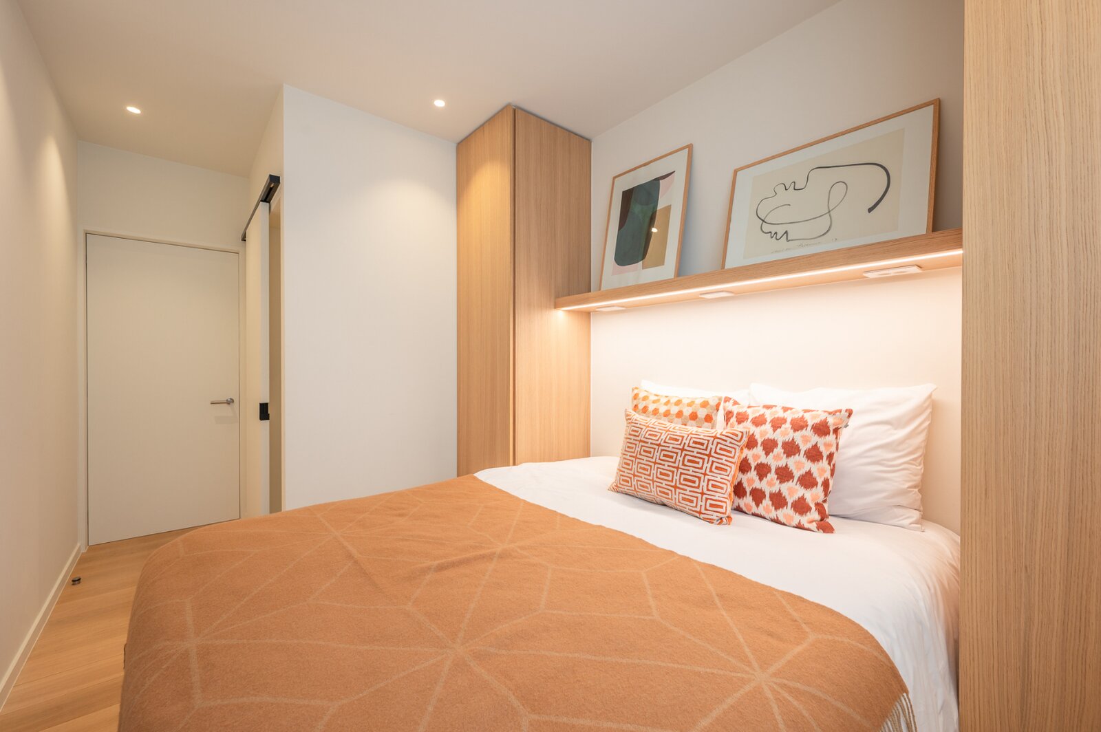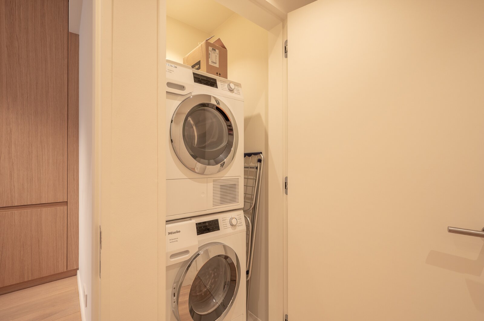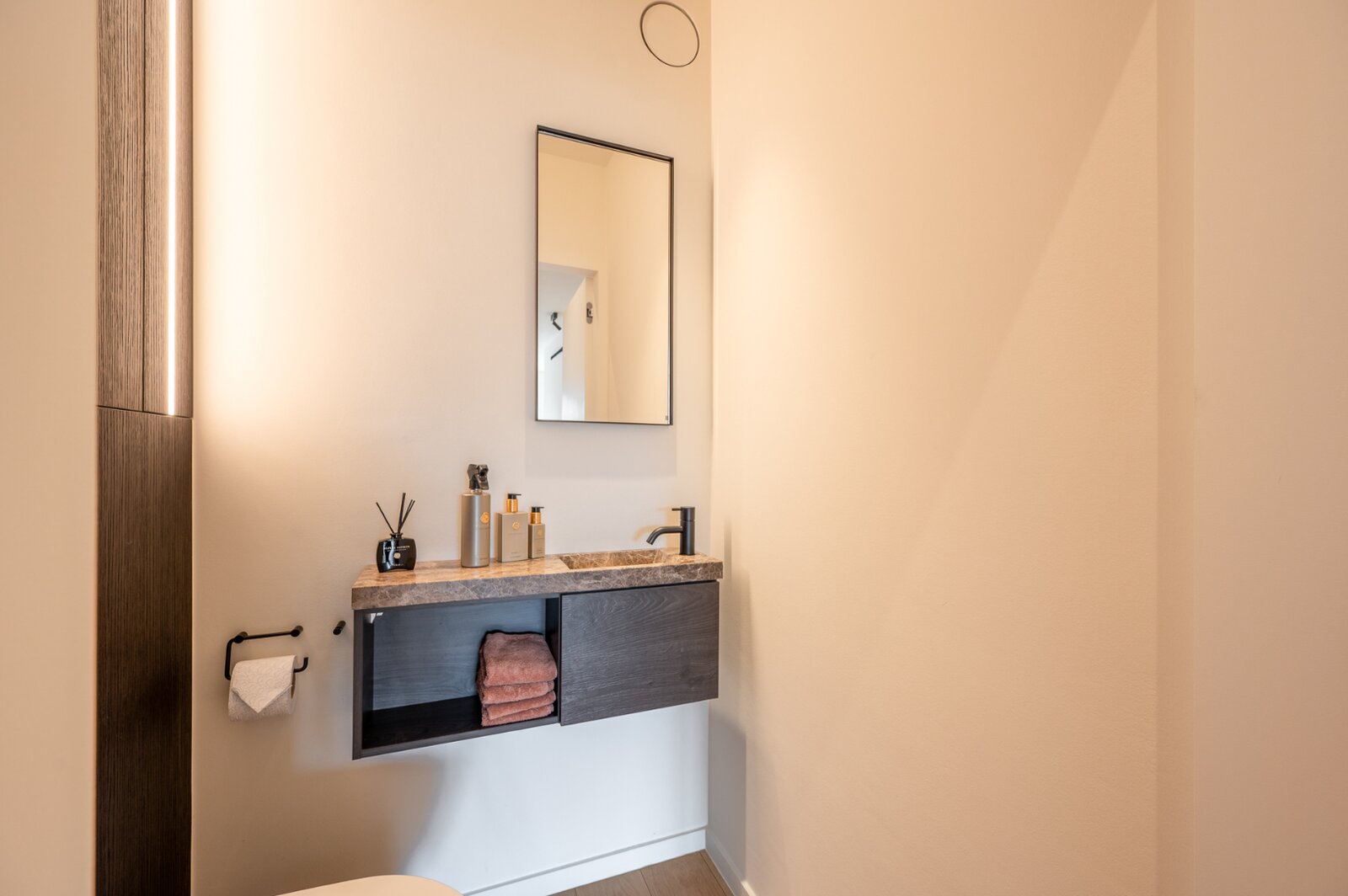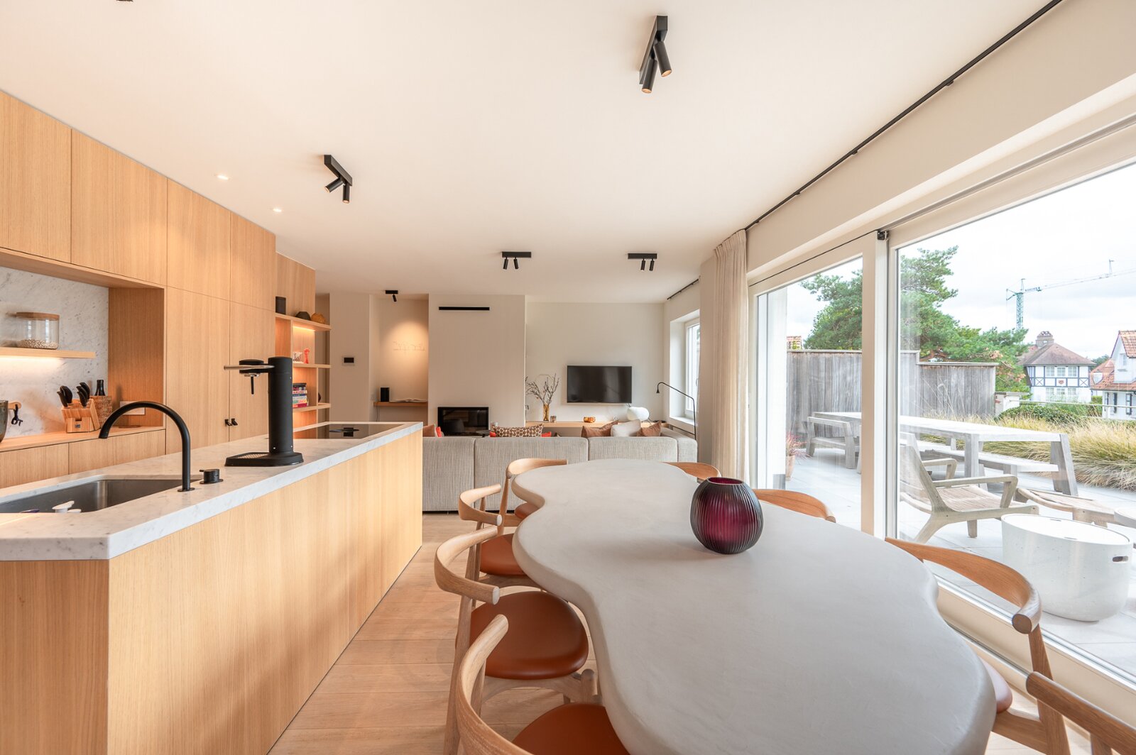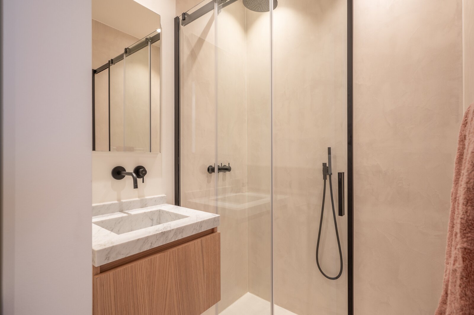 L'appartement a été aménagé avec des matériaux de haute qualité : armoires en placage de chêne, marbre de Carrare, béton ciré et parquet en chêne huilé. Domotique Bticino. Volets partout. Jardin conçu par Dominique Eeman avec arrosage automatique.