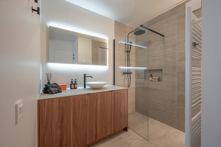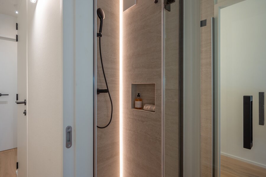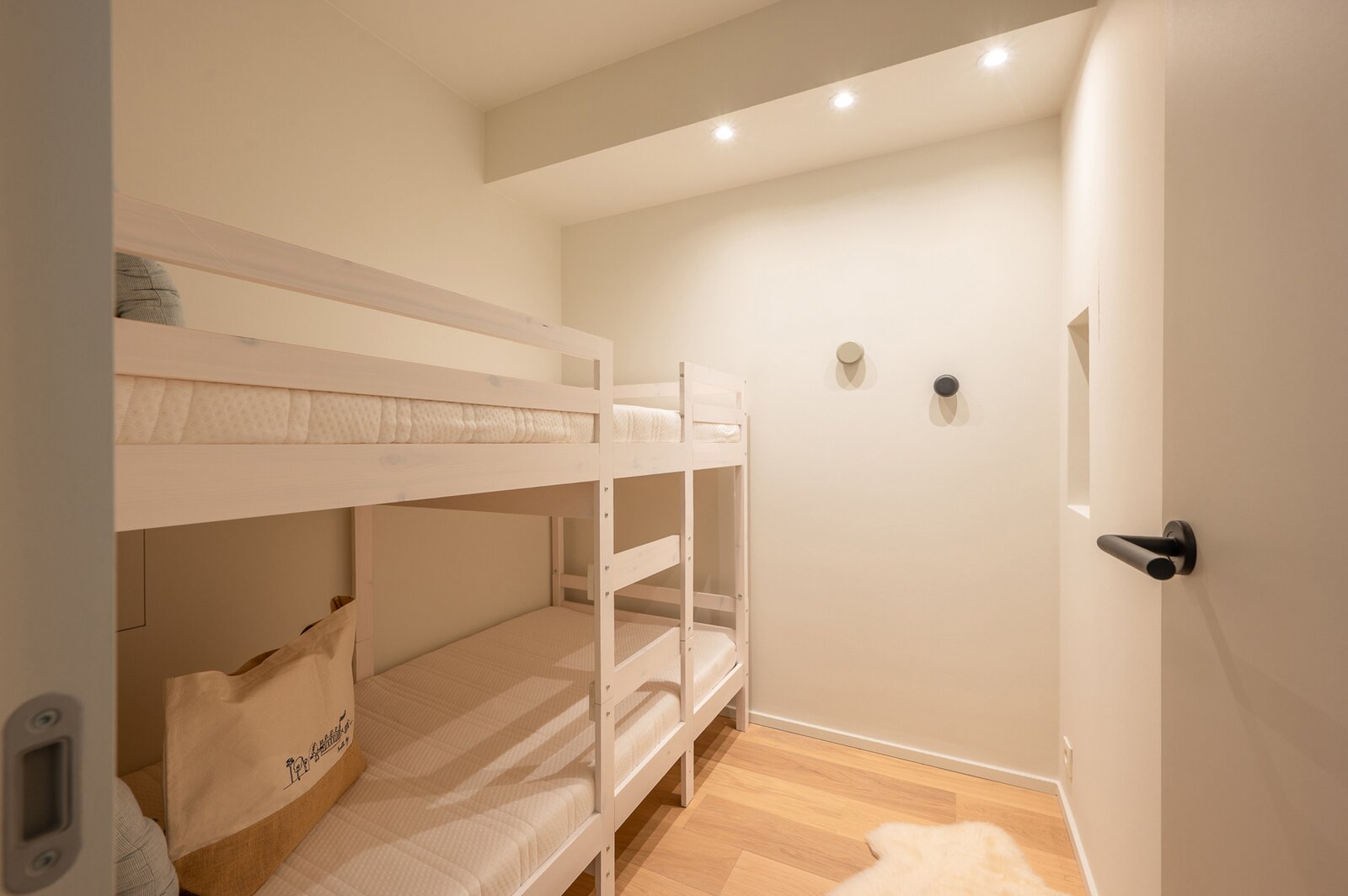 Le hall d’entrée dispose de toilettes invités et d’un vestiaire. À l’arrière, on trouve deux chambres spacieuses avec armoires encastrées, ainsi que deux salles de douche modernes. Une troisième chambre plus compacte peut accueillir un lit superposé ou être aménagée en bureau ou pièce polyvalente.