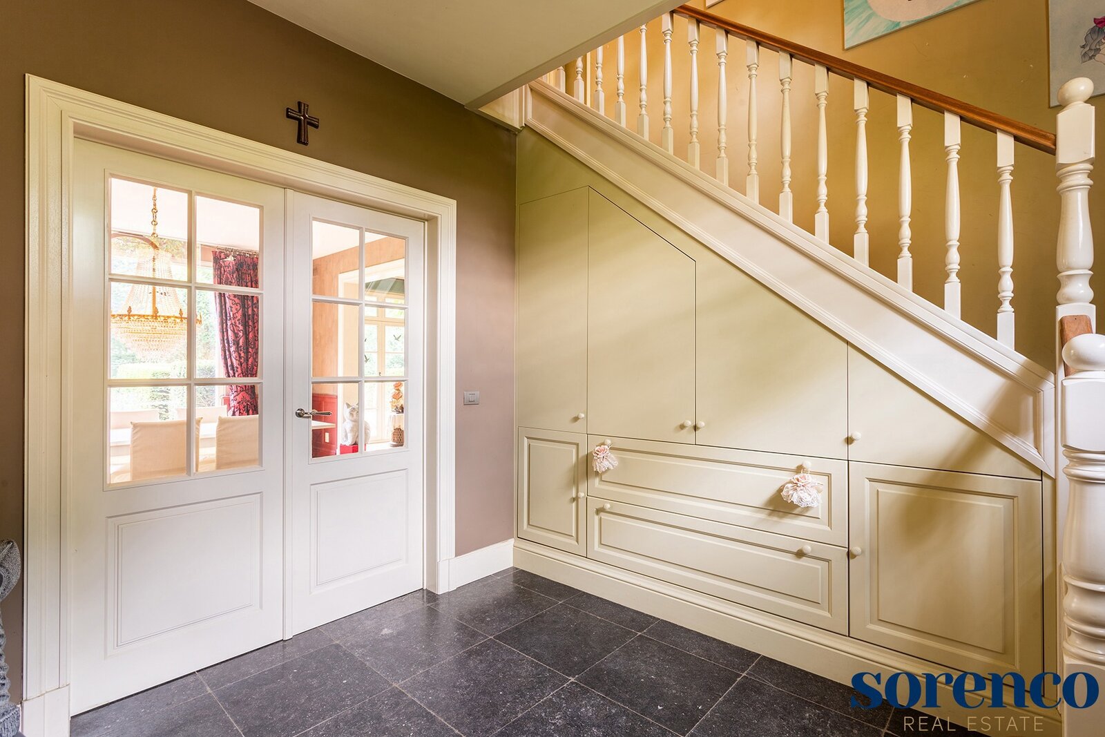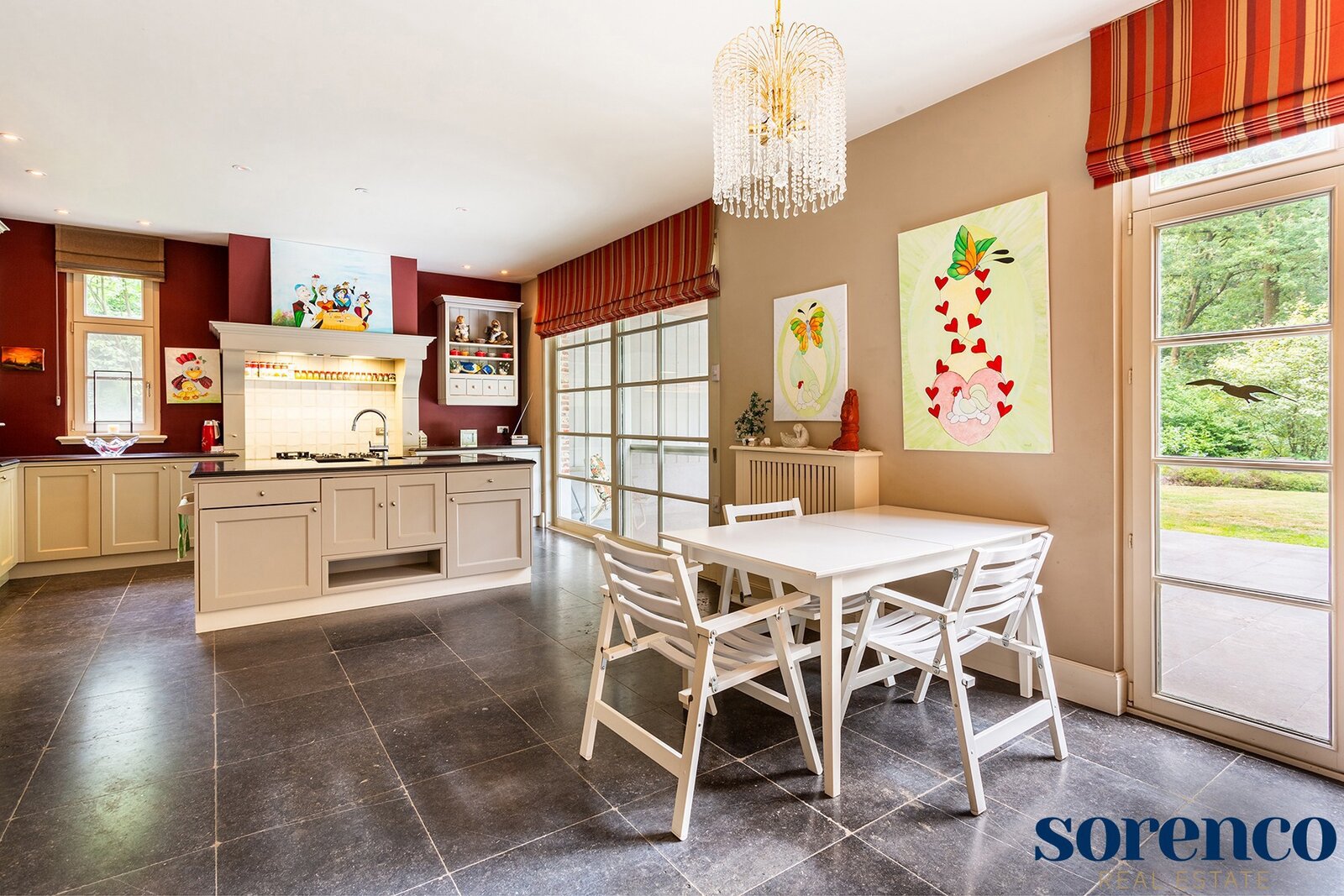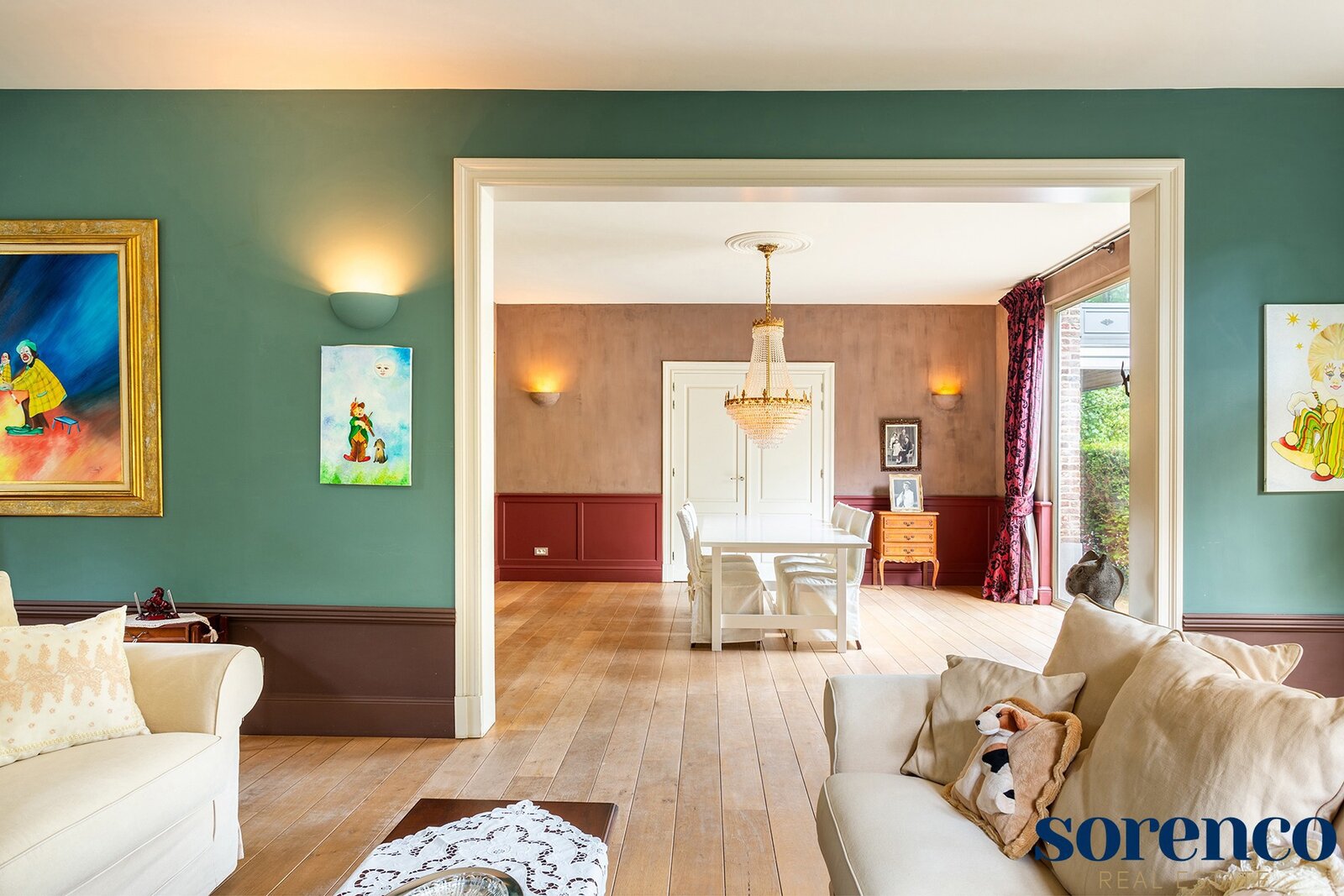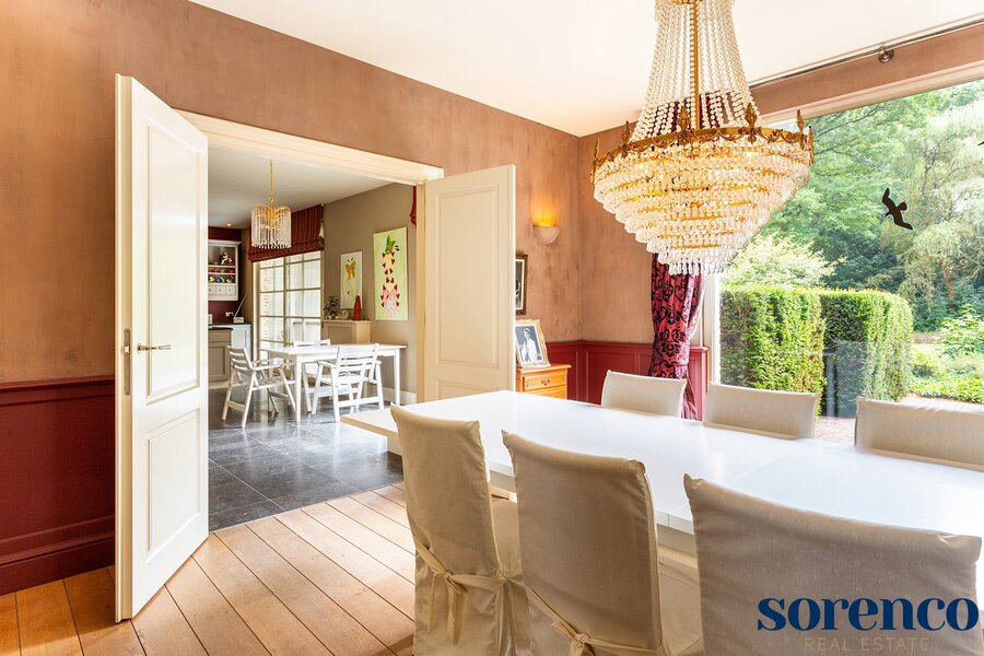 Via de INKOMHAL met apart toilet en vestiaire betreed u de woning. Vervolgens komt u in de WOONKAMER op parket ca. 41m². Vanuit de woonkamer, EETKAMER ca. 24m² en KEUKEN ca. 35m² geniet men van een prachtig uitzicht op de zuidelijk georiënteerde tuin met overdekt terras.