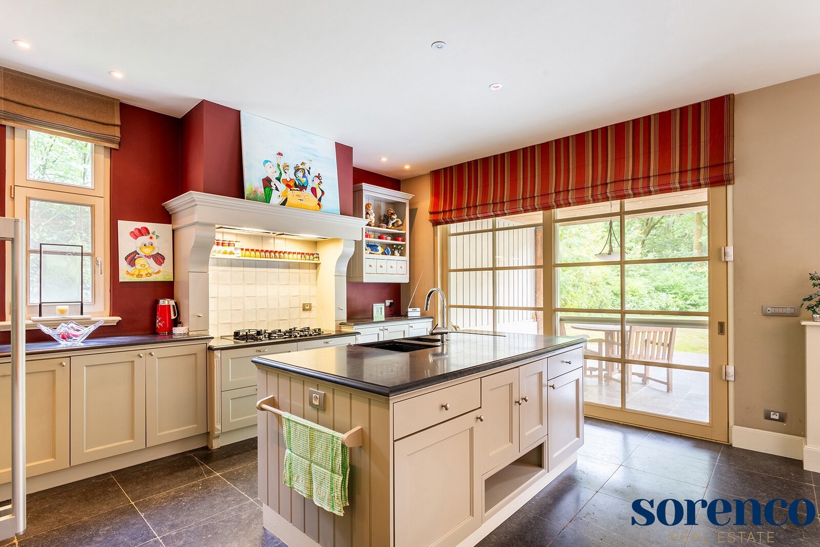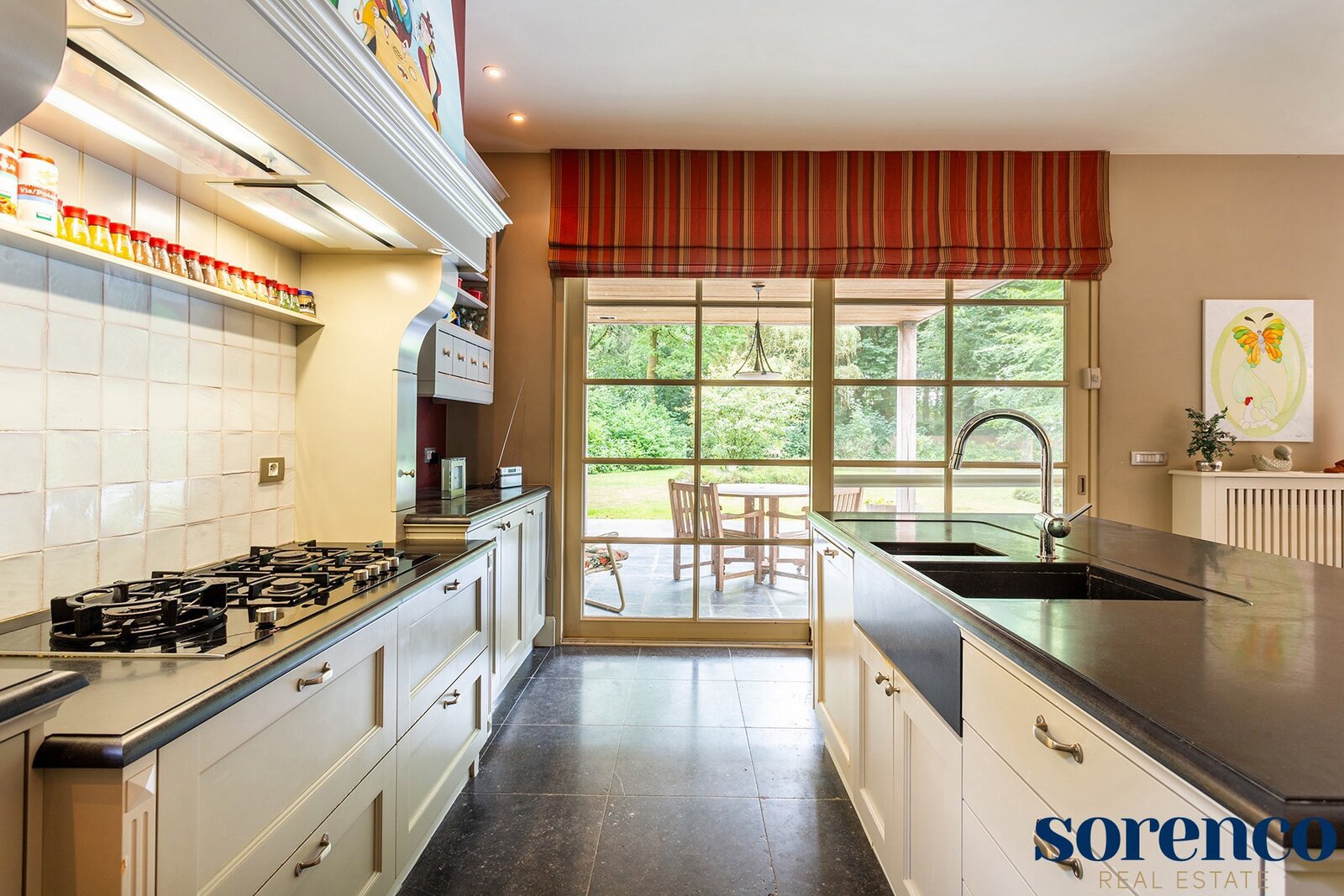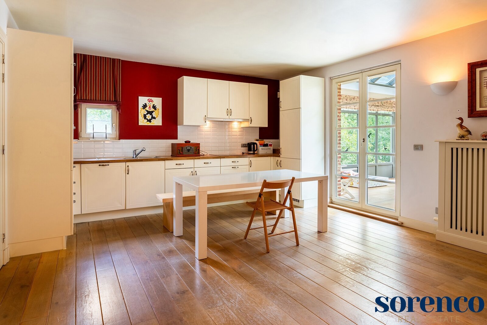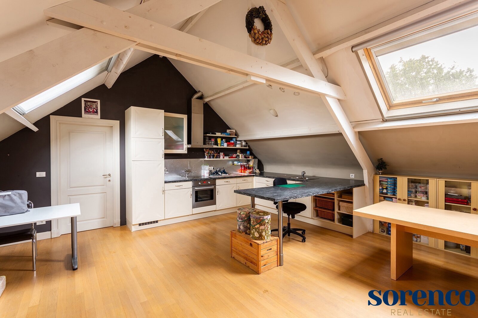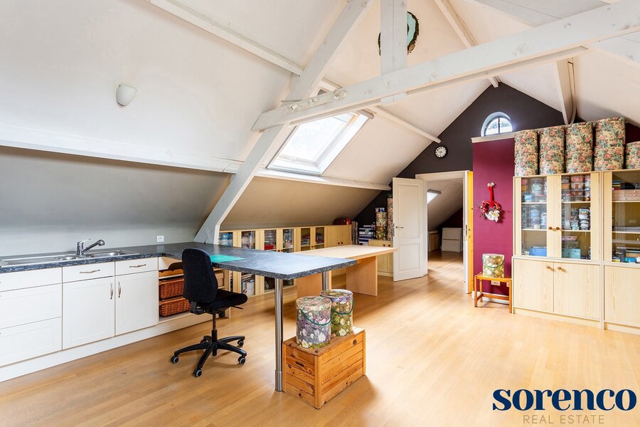 De volledig ingerichte KEUKEN met ontbijtruimte op natuurtegels is ruim en praktisch ingericht. Verder bevindt hier nog een BUREAURUIMTE van ca. 16m² op parket en een handige WASPLAATS van ca. 10m², beide toegankelijk via een aparte hal. De inpandige GARAGE van ca. 45m² met automatische poorten biedt plaats voor twee wagens. Een houten bijgebouw geeft plaats voor twee extra overdekte parkeerruimtes.
