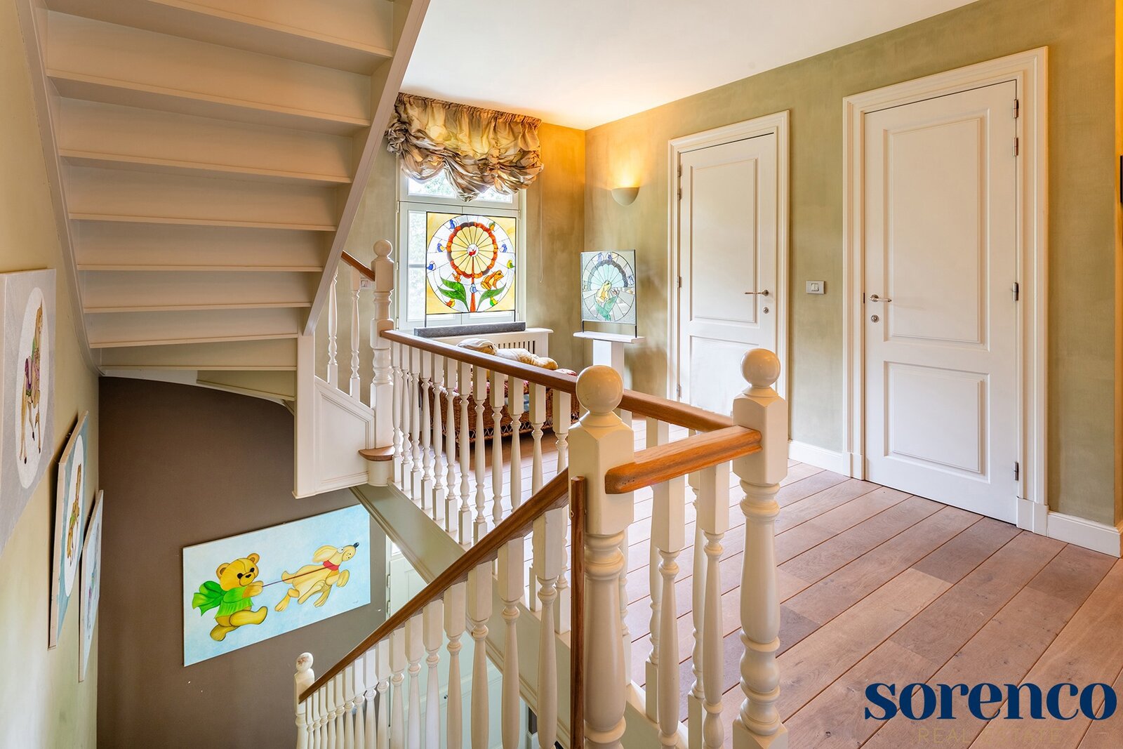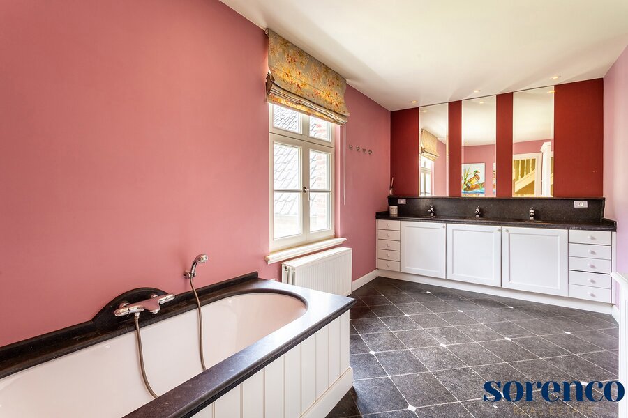 De eerste verdieping heeft een overloop op parket met een apart toilet. Drie SLAAPKAMERS ca. 18m², 20m² en 16m², allen op parket. De luxueuze BADKAMER ca. 15m² is uitgerust met een ligbad, drie lavabo's en een dubbele inloopdouche, prachtig afgewerkt met blauwe arduin.