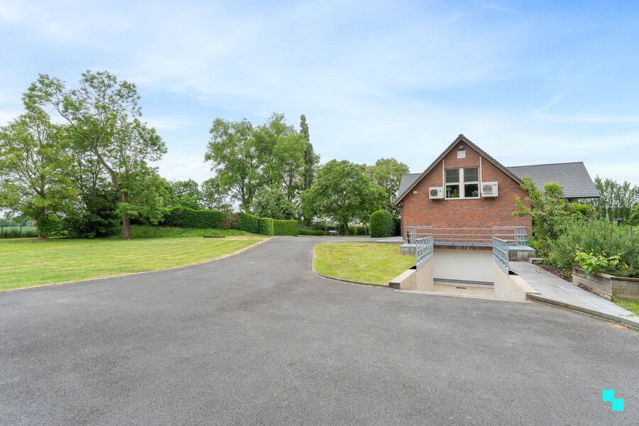 Gelegen in een landelijk gebied en omringd door uitgestrekte velden vinden we deze unieke ééngezinswoning terug. De verborgen parel is gelegen op een perceel van 12.816 m² en beschikt over een bewoonbare oppervlakte van 326m² (volgens EPC-attest). Ongeveer de helft van het perceel werd omgezet in bebossing, waardoor het tuinonderhoud een pak interessanter wordt. De woning is volledig onderkelderd en beschikt over een dubbele garage, voorraadkamer en polyvalente (opslag)ruimte. Inkomhal met vestiaire en gastentoilet, woonkamer met fantastisch zicht op de tuin, hyper geïnstalleerde keuken met aansluitend (overdekt) terras en annex berging/wasplaats. Open ruimte boven leefgedeelte, aansluitend de master bedroom met naastliggende slaapkamer die kan omgevormd worden tot badkamer (afvoer en toevoer voorzien). In de andere vleugel van de woning bevinden zich de drie overige slaapkamers en de geïnstalleerde badkamer. Volledig omheinde tuin, riante oprit met geautomatiseerde poort, inrijhelling voor garages in kelder, aparte garagebox, opbouwzwembad met sturing en de gezellige chalet. Het bijgebouw bestaat uit een apart toilet, leefruimte met keuken en aansluitend de slaapkamer met douche en wastafel. CV op aardgas (HR ketel 2021) | HR beglazing aluminium | EPC label B | Warmtepomp (airco) in leefruimte en alle slaapkamers | Zonnepanelen 12.390 Wp. Laurence (BIV 541 501) organiseert voor deze woning de bezoeken, mits het maken van een afspraak.