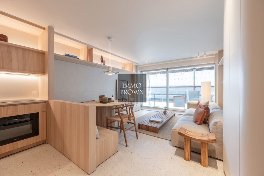 Appartement rénové avec des finitions de qualité, vue frontale sur la mer, situé entre Albertplein et la promenade.